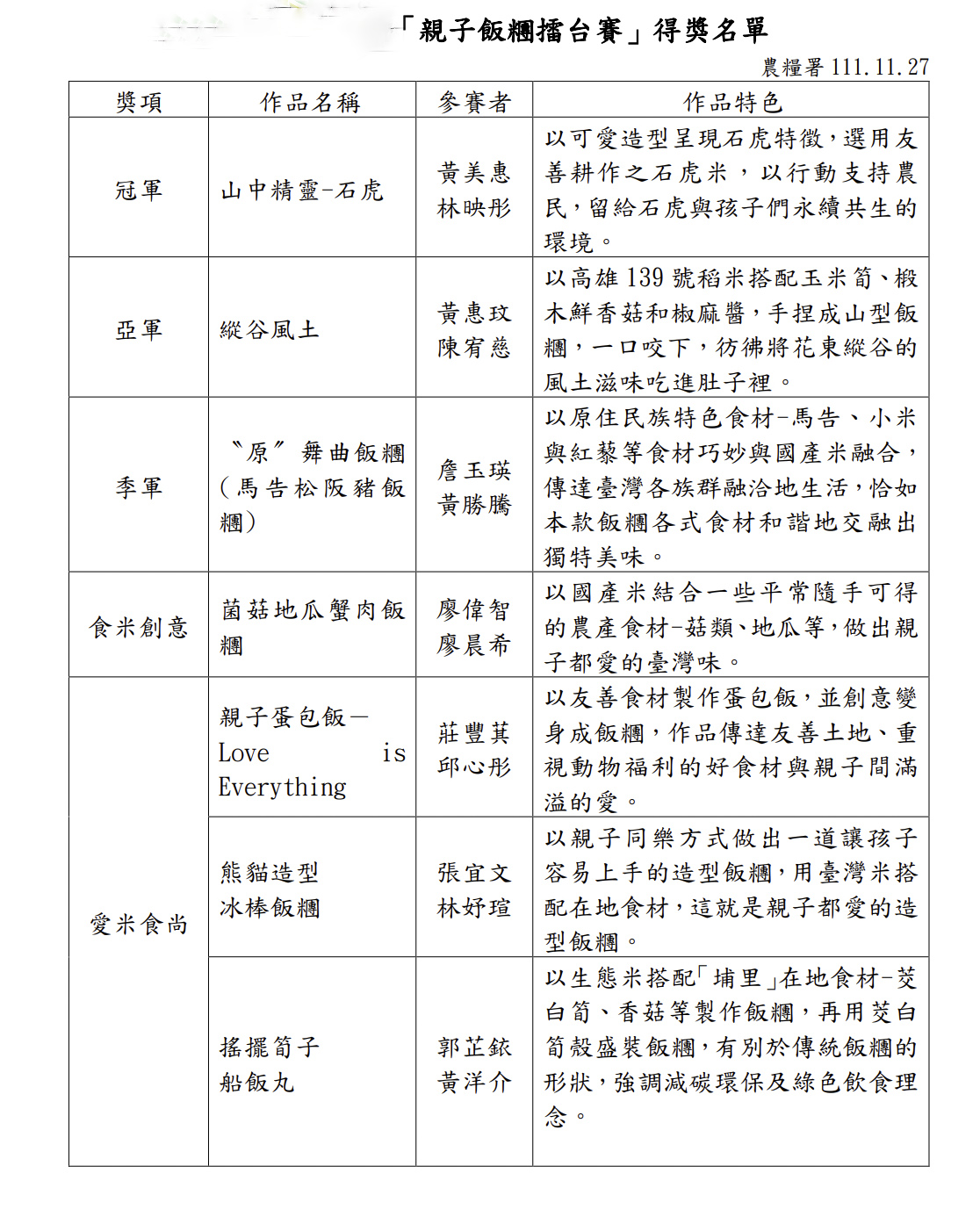 經過專業評審團試吃評分後,選出冠、亞、季軍、食米創意、愛米食尚及食米玩家等獎項,冠軍由小蘋果的廚房(黃美惠、林映彤母女)製作的山中精靈-石虎奪得,以可愛造型呈現石虎特徵,選用友善耕作之石虎米,用行動支持農民,留給石虎與孩子們永續共生的環境,亞軍由(黃惠玟、陳宥慈母女)製作的縱谷風土,以高雄139號稻米搭配玉米筍、椴木鮮香菇和椒麻醬,手捏成山型飯糰,一口咬下,彷彿將花東縱谷的風土滋味吃進肚子裡,季軍由美食獵人(詹玉瑛、黃勝騰母子)製作的〝原〞舞曲飯糰(馬告松阪豬飯糰),以原住民族特色食材-馬告、小米與紅藜等食材巧妙與國產米融合,傳達臺灣各族群融洽地生活,恰如本款飯糰各式食材和諧地交融出獨特美味,本次選手們完美掌握國產米Q彈美味,透過巧手展現出飯糰方便性與好滋味。