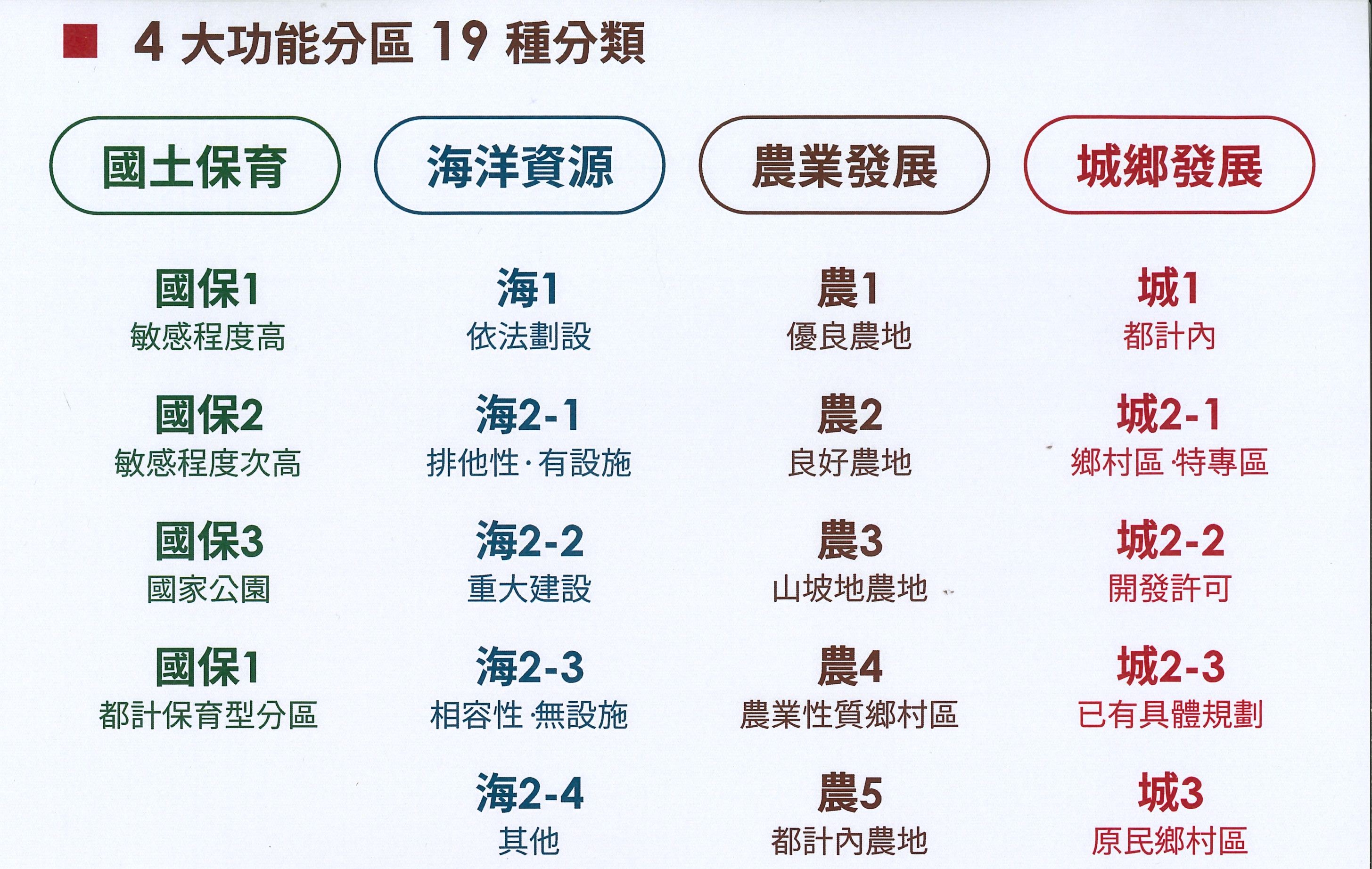地政處表示,國土計畫依「保育」、「利用」、「復育」、「管理」及「永續」等目標,以及各縣市國土整體空間規畫願景,將土地劃設為4大功能分區及19種分類,包含國土保育地區(5類)、海洋資源地區(5類)、農業發展地區(5類)及城鄉發展地區(4類)。