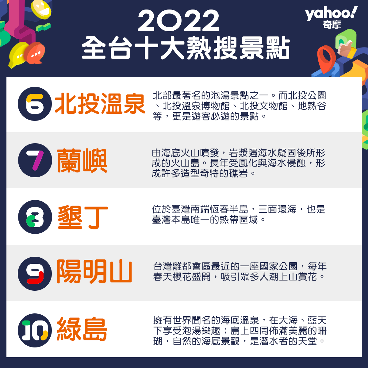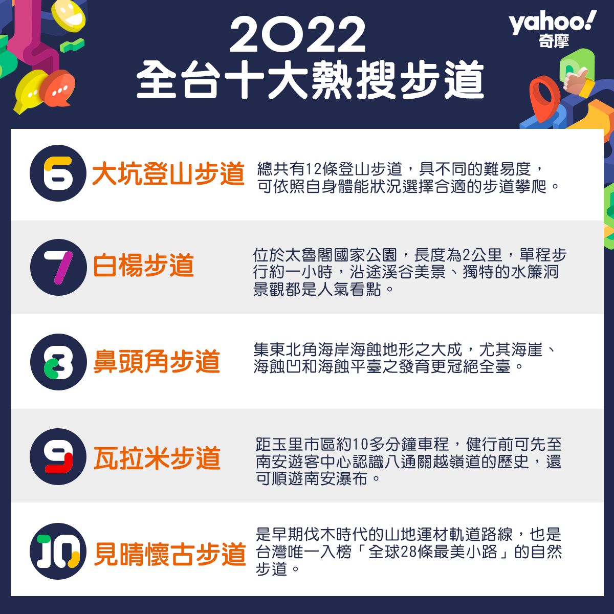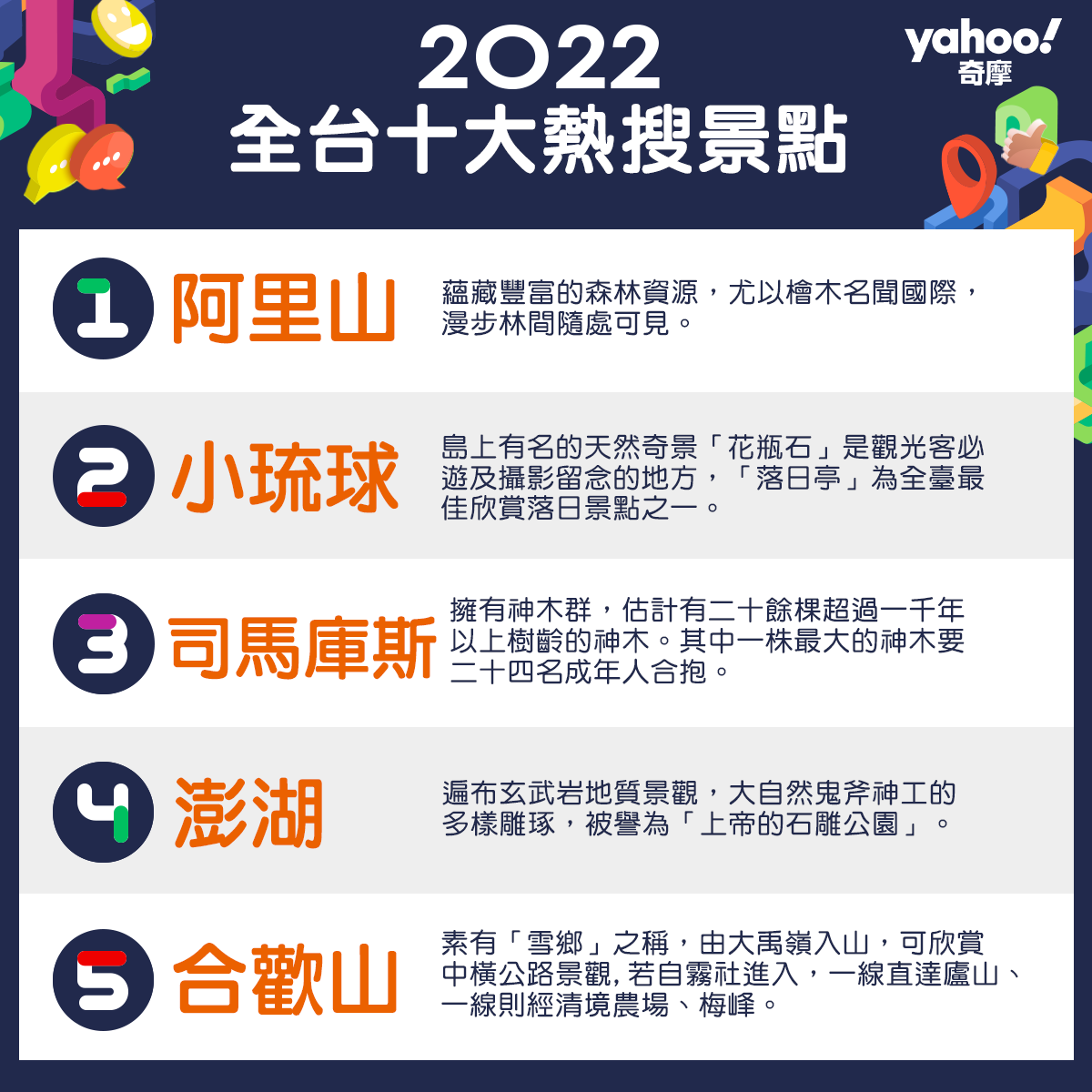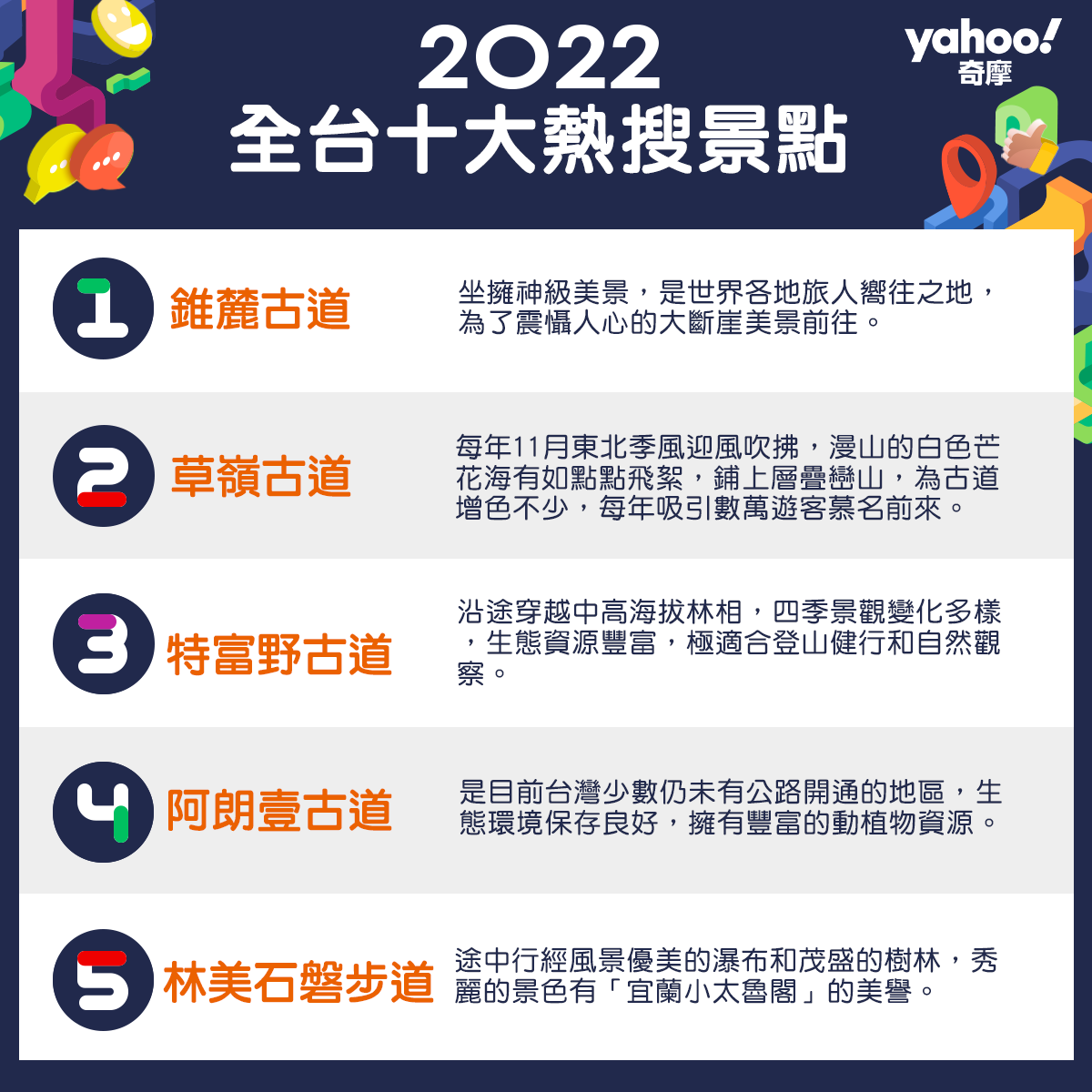隨著疫情發展趨緩,加上政府祭出國旅補助,國內迎來「報復性旅遊」浪潮,適逢室外口罩禁令解除,可望再次迎來踏青旅遊風潮,Yahoo奇摩今(30)趁勢公布2022年度最熱門十大旅遊榜單,包括「台灣十大必去景點」及「台灣十大絕美步道」,讓大家直接收錄口袋名單!回顧台灣十大必去景點,國人傾向遠離塵囂的山海旅遊,榜單由「阿里山」奪冠,「小琉球」、「澎湖」、「蘭嶼」、「綠島」四離島則搶霸4席!台灣十大絕美步道中,由太魯閣國家公園境內唯一史蹟保存區的「錐麓古道」最受關注;難度不高、適合家人親子同遊的 「林美石磐步道」、「大坑登山步道」等也深受國人喜愛;奪下金鐘獎最佳戲劇的《斯卡羅》拍攝秘境「阿朗壹古道」也榜上有名!