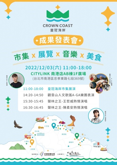 交通部觀光局北海岸及觀音山國家風景區管理處(以下簡稱北觀處) 推動的「皇冠海岸觀光圈」從110年底開始籌組,經過1年的盤整、形塑輔導、學習及串連,終於要在12月3日(星期六)CITYLINK南港店AB棟1F廣場與大家見面,現場有特色市集、精彩展示及聲林之王人氣歌手到場助陣,不定時舞台活動,將送出超過100份的精美禮物,北觀處歡迎全國好朋友到場見證皇冠海岸觀光圈1年來的蛻變。「皇冠海岸觀光圈」範圍從觀音山、北海岸到基隆,藉由盤點及整備,選出30間產業風格形塑店家,舉辦14次「皇冠觀光創造所」,串連出6條以上經典遊程,12次媒體及觀光業者踩線行程,台北、高雄2次同業媒合會議,3場次跨域標竿學習,30場以上的交流會議,已經讓皇冠海岸觀光圈產生新的火花,並發展出區域間共好及合作模式,這些豐碩成果將在12月3日CITYLINK南港店AB棟1F廣場展出,讓與會民眾了解皇冠海岸觀光圈整備及籌組的願景與成果。