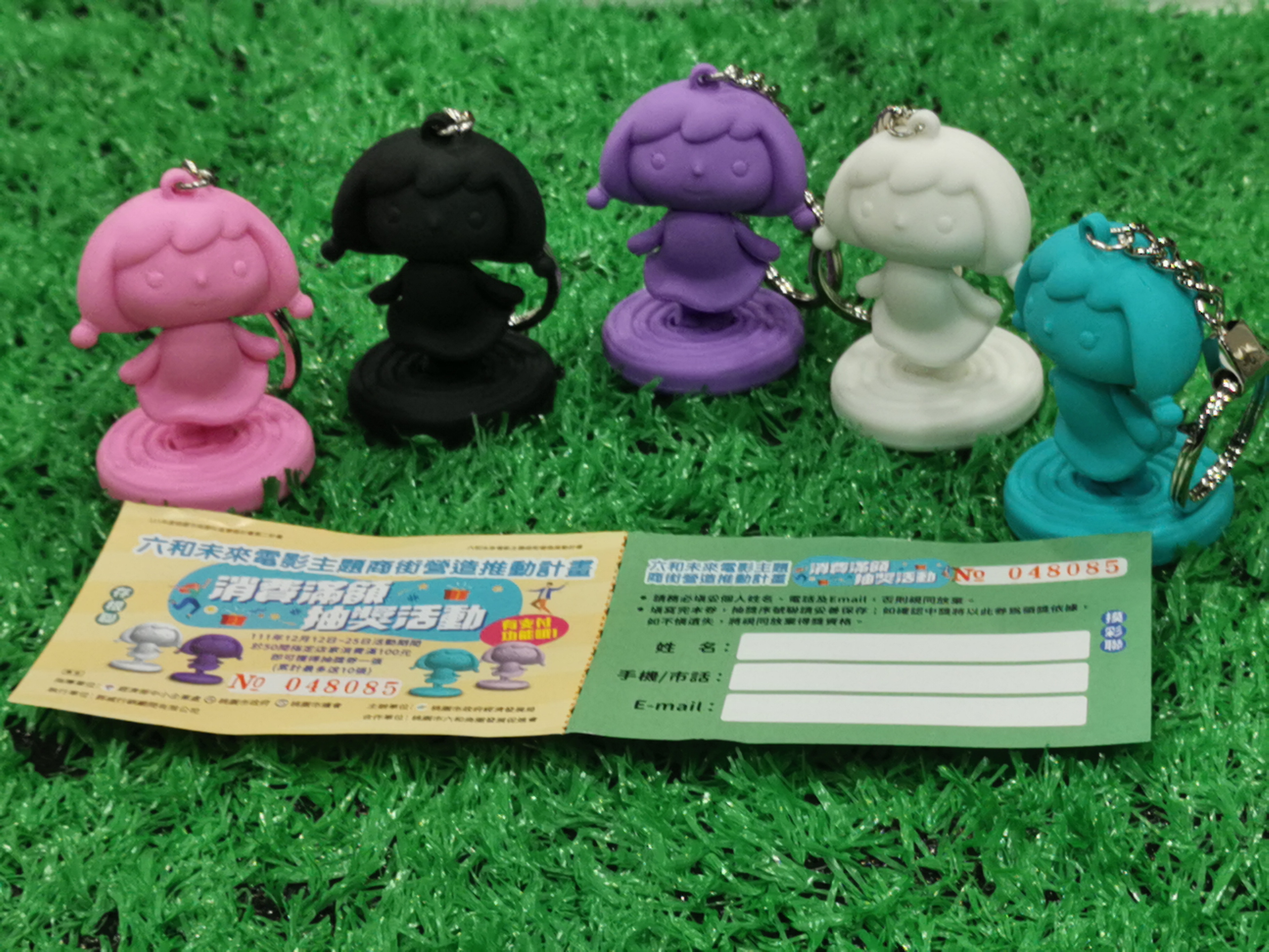 於【桃園·六和商圈】【桃味遊園】【桃好您的心】3個FB粉之活文留言處上傳與商圈內任3 隻公仔合照tag一位朋友,經場工作人員查無誤.即可獲得六和妹妹公仔吊飾1隻。定量贈送100隻恕不挑色)送完為止
