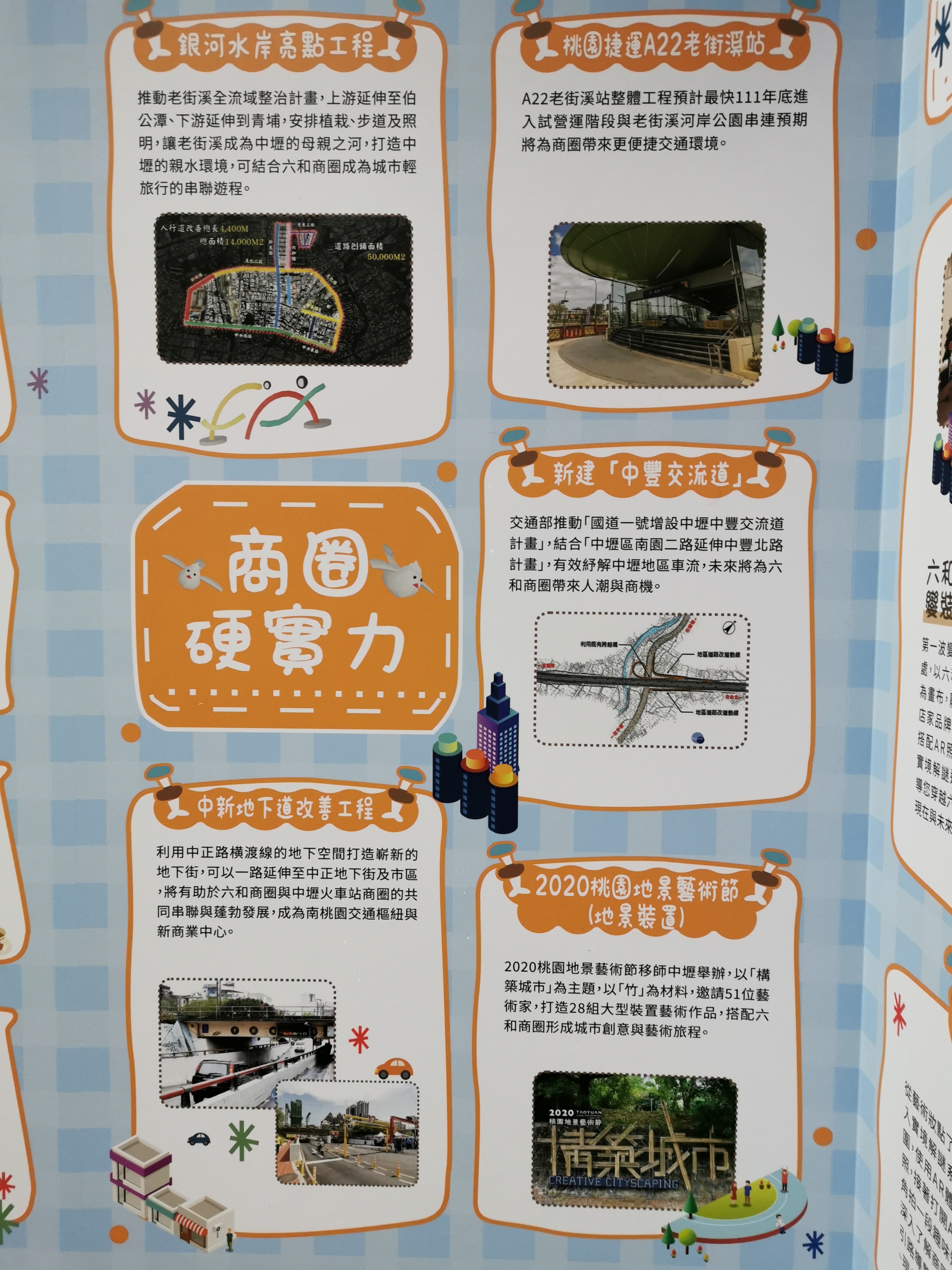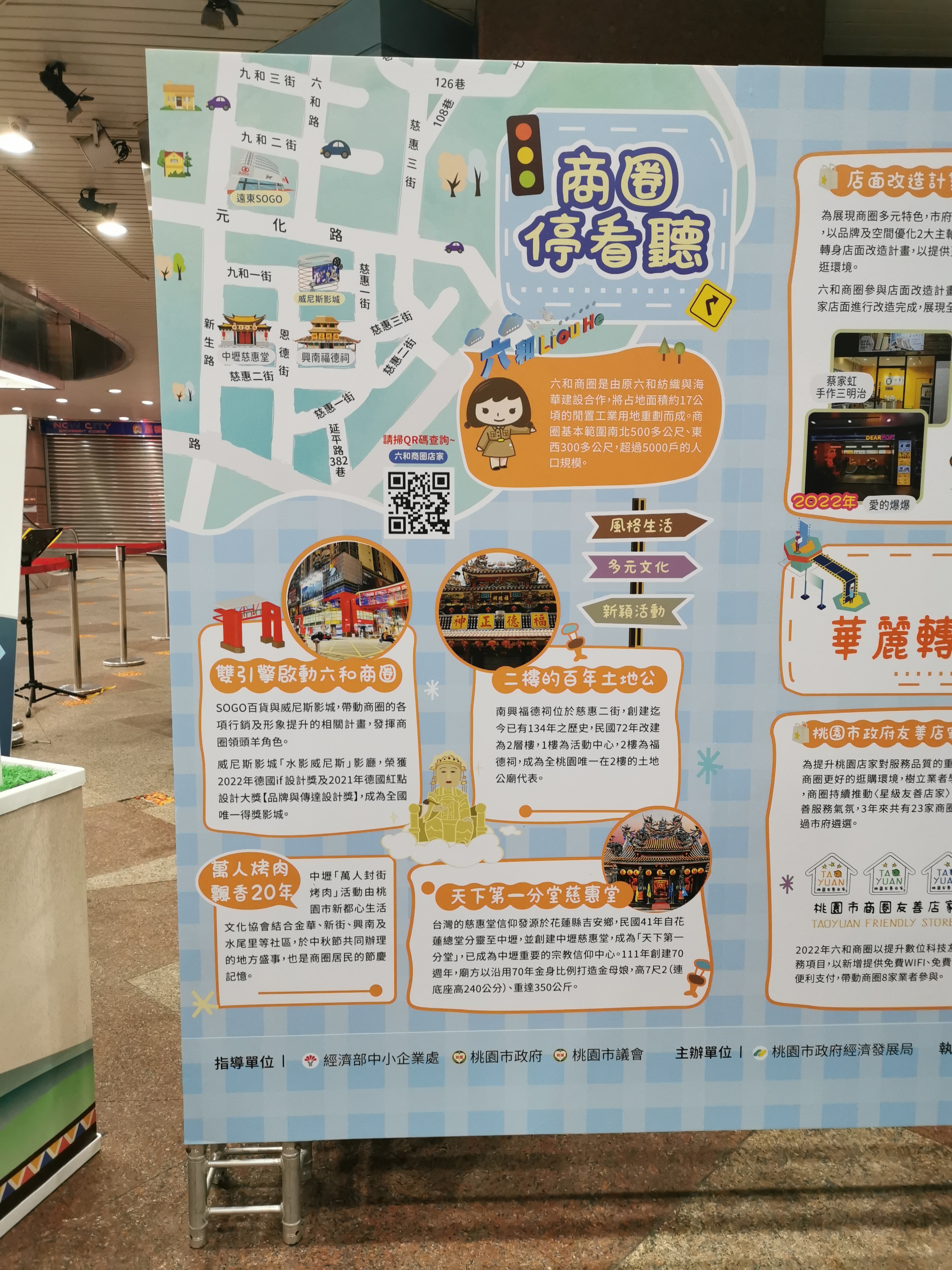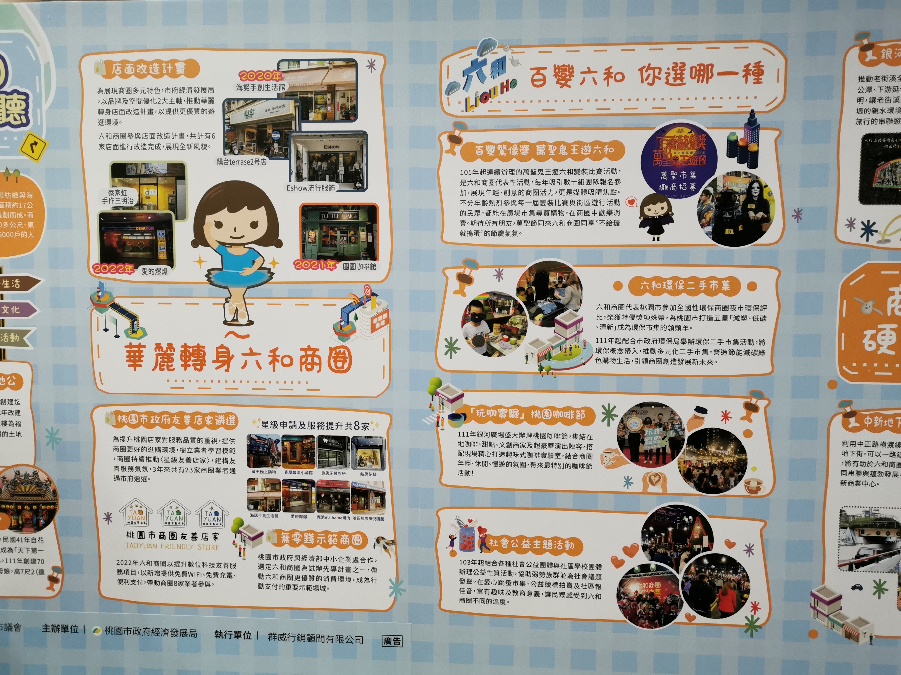活動內容:靜態成果展將展現商圈特色與111年桃園市商圈街區輔導畫一第二項計畫六和商圈「六和未來電影主題商街營造動計畫」計畫果、以6面展示板方式展出提供民眾瀏覽,另外.現場設活動服務台有人員隨時提供解說、還有6款式的手拿板可以照打卡。