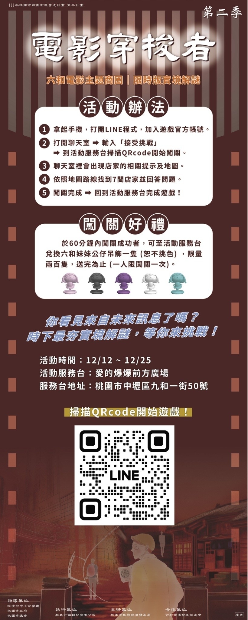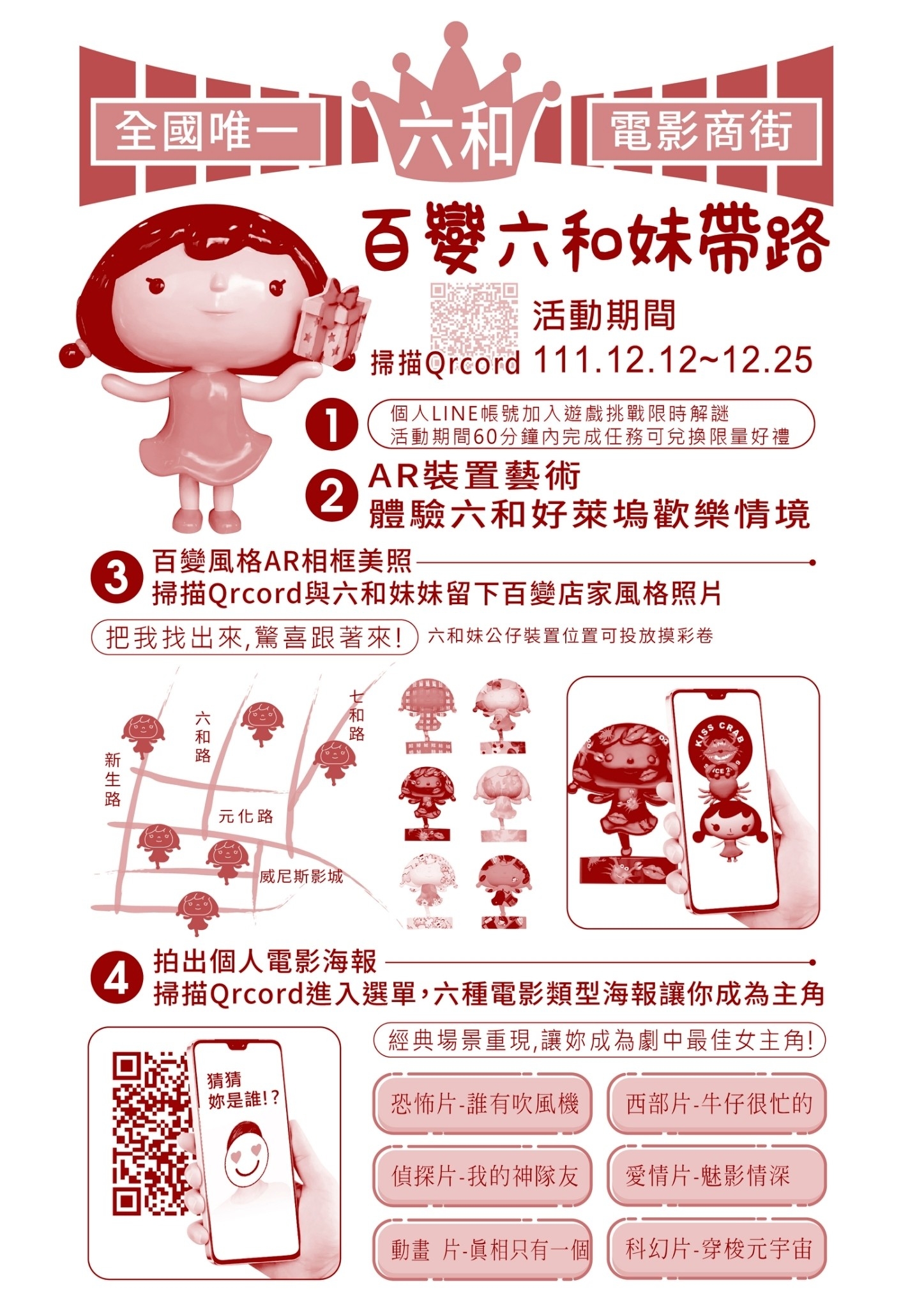 活動內容:劃4梯次的商圈免導覽活動,由導覽人員帶領參加遊逛商圈.介紹商圈背景歷史與在地特點並體驗實境解謎、AR互動等項目.參加導覽活動民眾可獲得六和妹妹公仔吊飾一隻(恕不挑色)。
