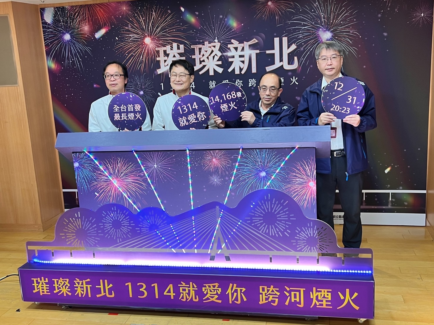為了與大家一同迎接2023年,新北市政府再度推出「璀璨新北-1314就愛你跨河煙火」,將於2022年12月31日20時23分,在淡水河兩岸的淡江大橋、淡水漁人碼頭旁河面、八里水上運動中心三個地點,首創「兩岸三地」同步施放,讓民眾在淡水、八里兩岸都能觀賞精彩美奐的煙火秀,跨河的壯觀、近距離的震撼,讓視覺、聽覺感官都有更驚奇的體驗。