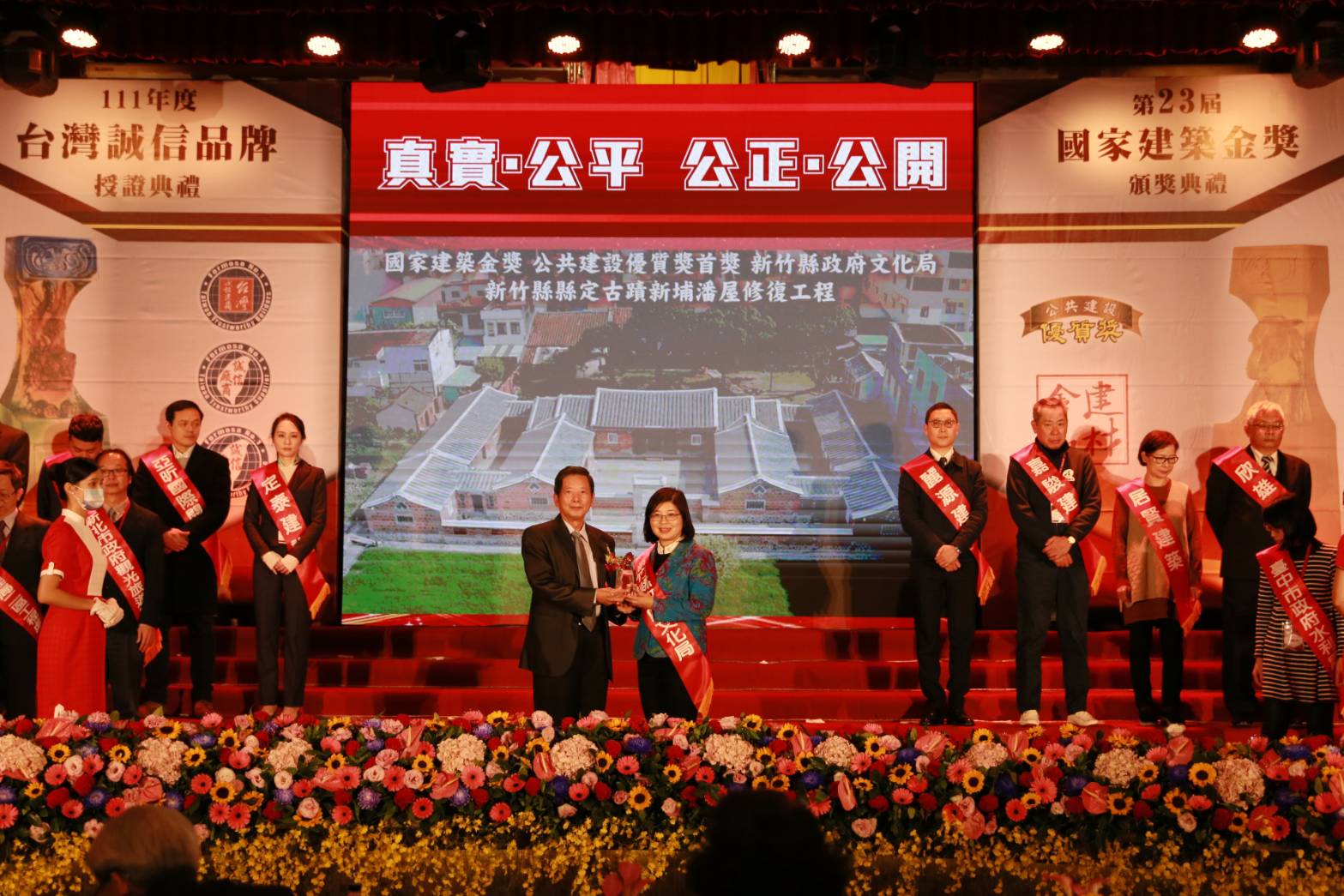 縣府文化局長李安妤15日出席頒獎典禮,她表示新竹縣長楊文科上任後,重視公共工程品質,要求各局處提升並精進公共工程管理與效率。文化局首度參加國家建築金獎評選,就獲得首獎殊榮,感謝行政院文化部及文化資產局、新埔潘氏所有權人、工程團隊黃天浩建築師事務所、潤昶有限公司等公私協力合作,讓本案圓滿完成。