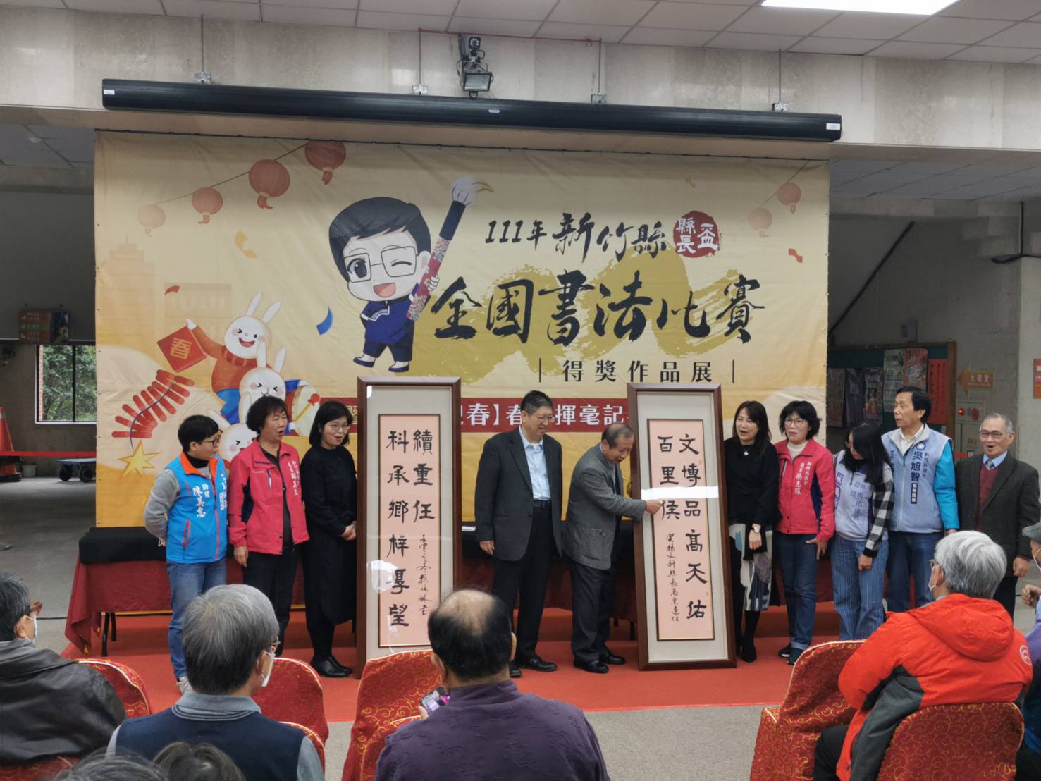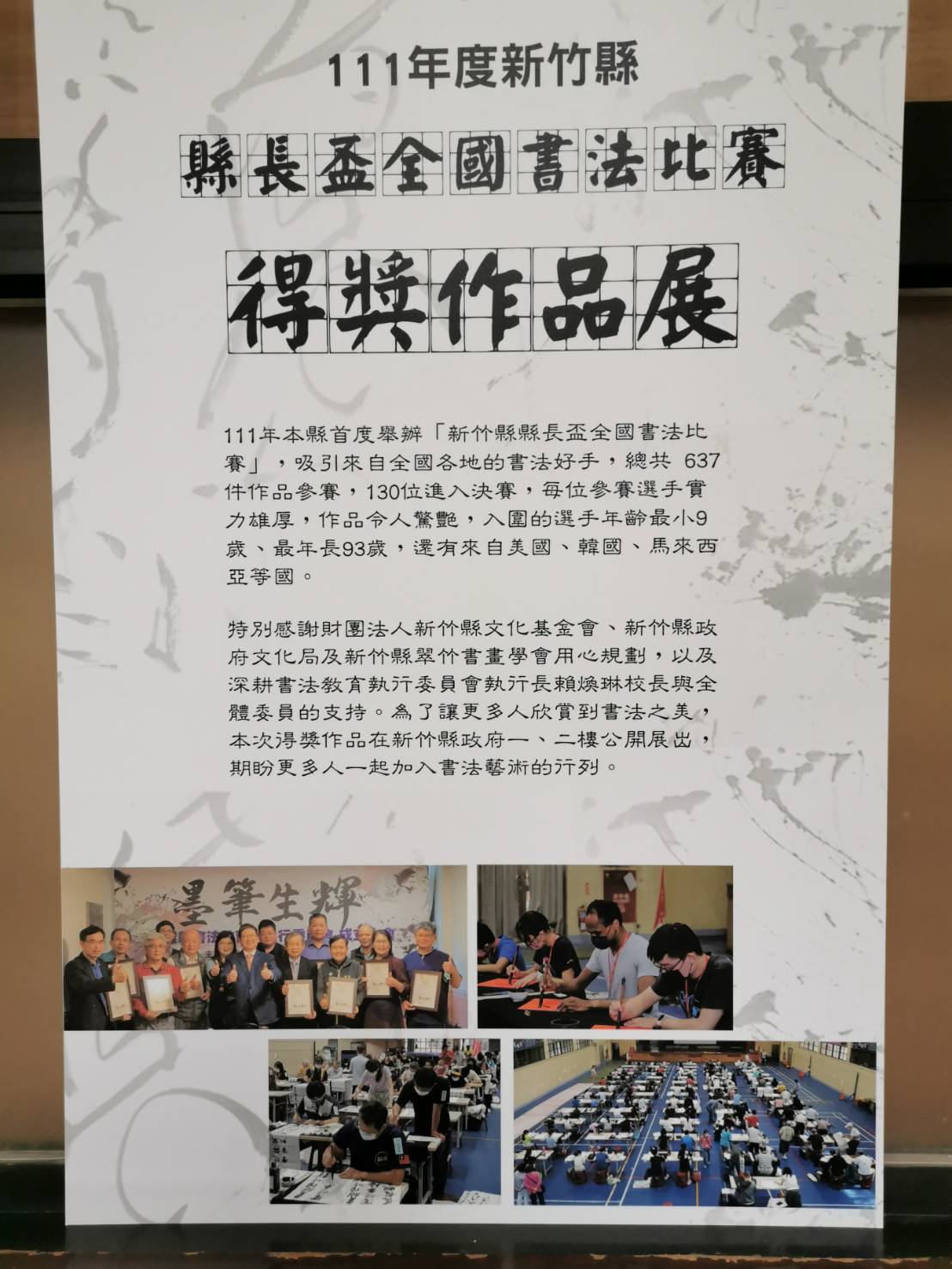 由財團法人新竹縣文化基金會主辦之「111年新竹縣縣長盃全國書法比賽得獎作品展」展覽日期自即日起至112年6月30日止,於本府1、2樓長廊展出,共計展出40幅得獎佳作,新竹縣長暨新竹縣文化基金會董事長楊文科歡迎鄉親蒞臨欣賞。