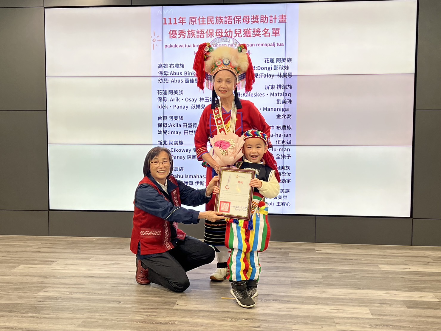 ▲由原住民族委員會副主委林碧霞進行表揚,頒發優秀族語保母陳菊江及幼兒陳翰獎狀。(圖/新北市政府原民局提供)