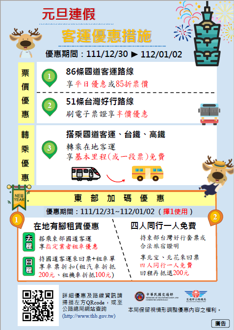 112年元旦連續假期即將到來,本次連假客運優惠自111年12