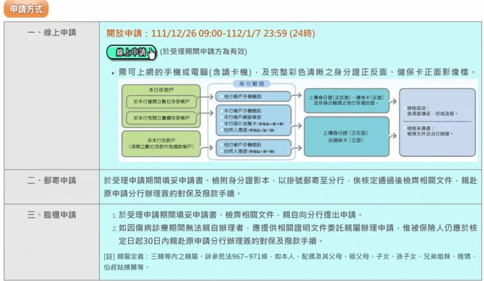 112年勞工保險被保險人紓困貸款已開辦,每人最高貸款金額新臺幣10萬元。新竹市政府表示,截至去(111)年底,已逾7萬4千戶申請,申請期限雖至112年1月7日止,但總貸款額度以200億元為原則,高虹安市長提醒有需求且符合申請資格的勞工朋友,儘早以網路、郵寄或臨櫃等方式擇一提出申請。