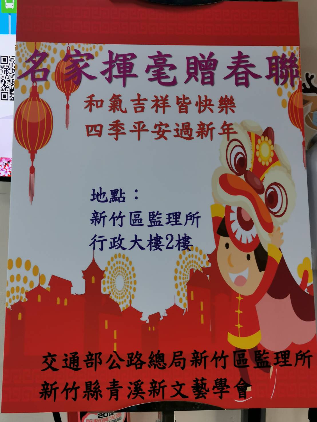 新竹區監理所結合新竹縣青溪新文藝學會於112年1月5日上午10時於2樓大廳舉辦現場揮毫贈春聯活動,歡迎洽公民眾索取春聯提早感受年節氣氛。