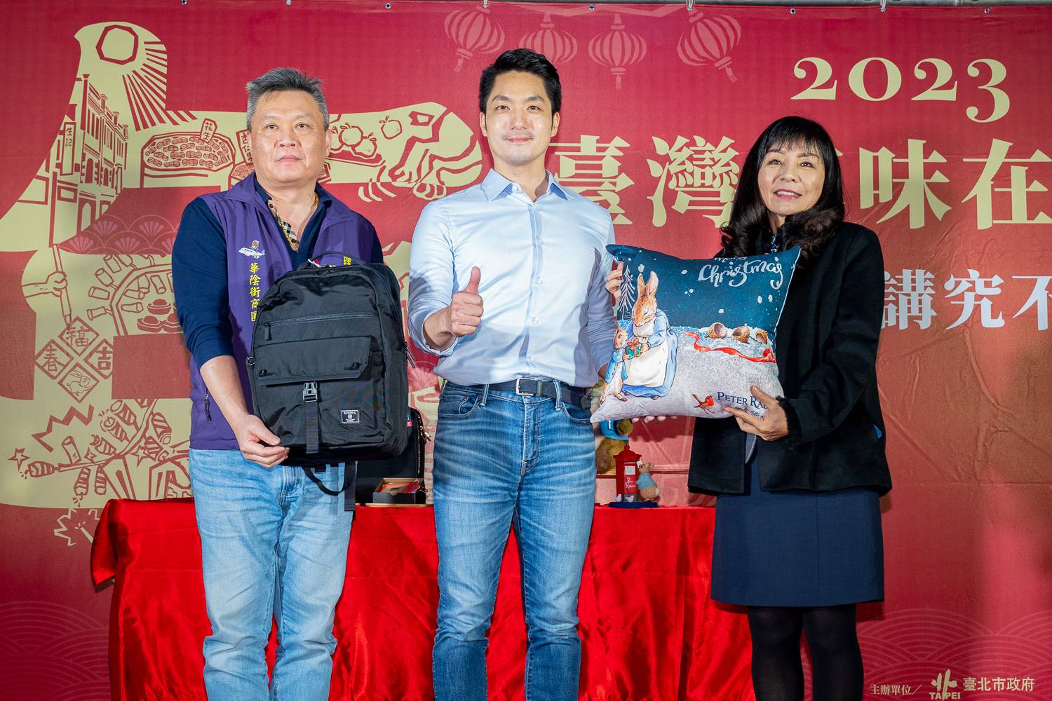 後站、華陰街北車商圈理事長致贈商圈特色產品辦公室小物給蔣萬安市長.
