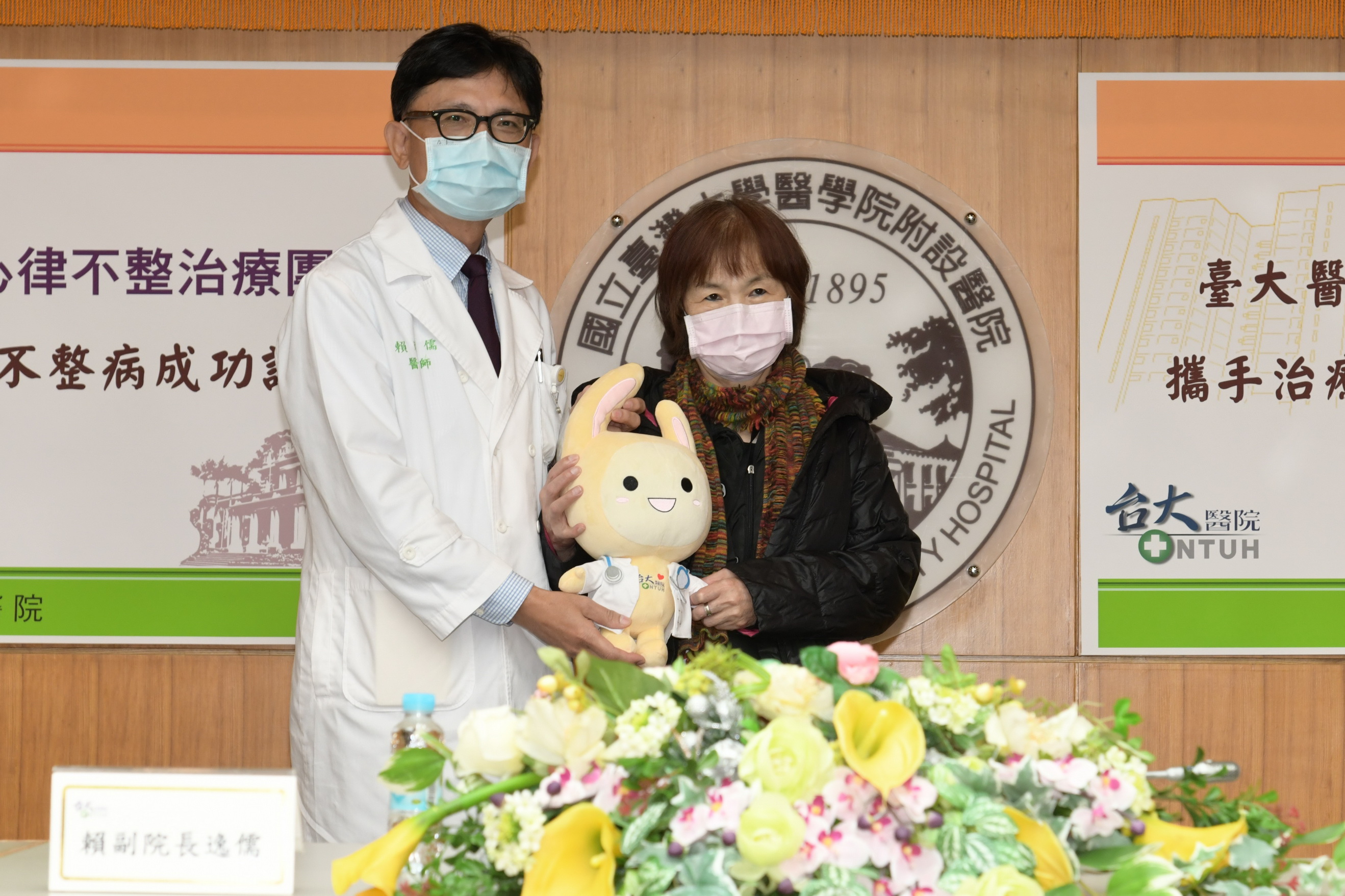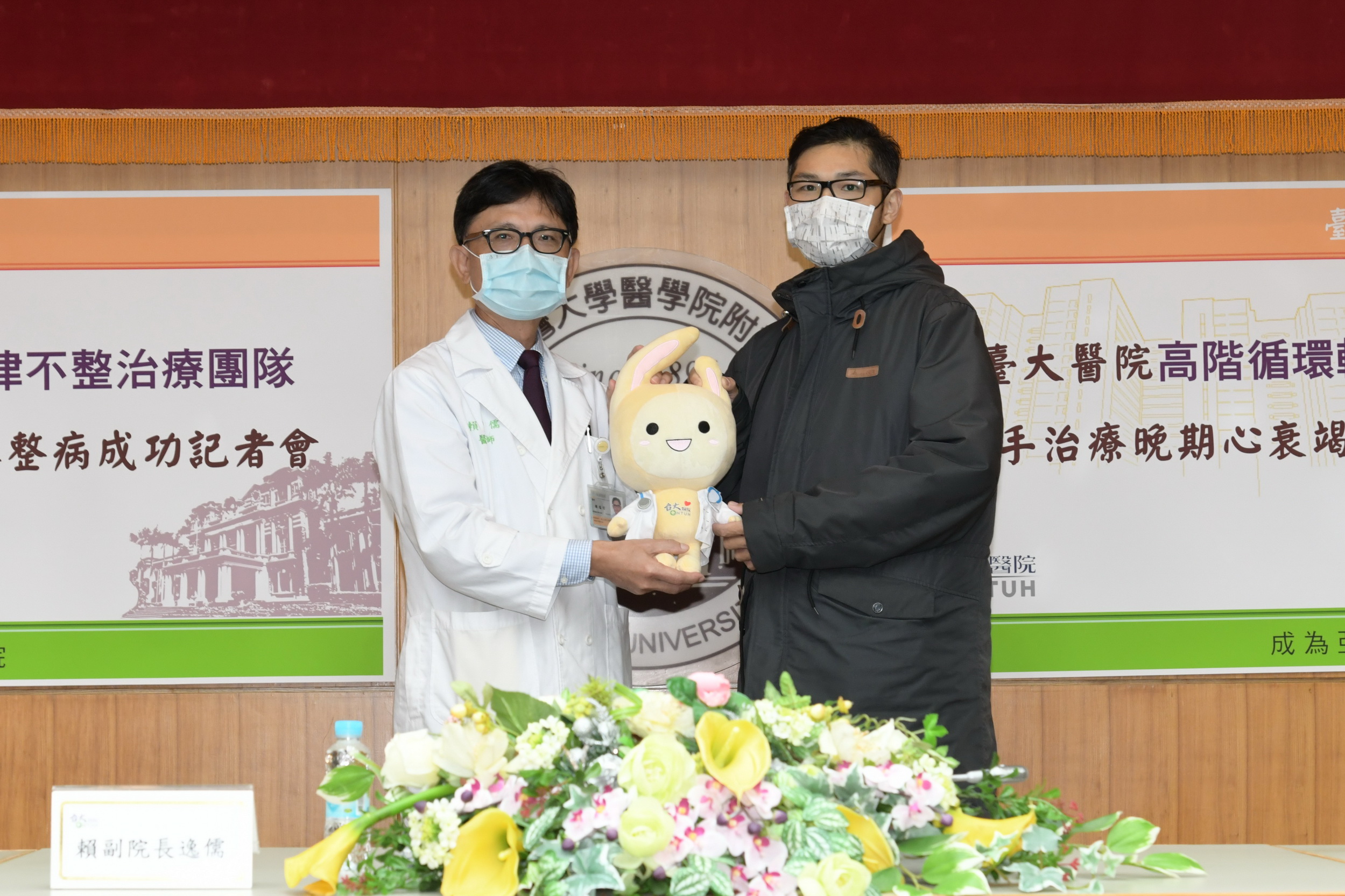 臺大醫院高階循環輔助團隊與心律不整治療團隊 攜手治療晚期心衰竭併嚴重心律不整成功記者會-賴逸儒副院長致贈吉祥物醫寶玩偶予病友