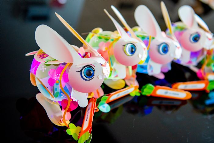 觀旅局長周柏吟表示,兔年小提燈「幸福兔」是由紙雕小提燈原創人洪新富老師及桃園在地藝術家蕭民遠共同為桃園燈會量身打造,其中「幸福兔」由8個圓形組合而成,有圓融、圓滿之寓意,外型刻繪著復興櫻花、客家桐花、石門槭樹、繽紛花彩節圖案,展現桃園四季花卉意象,而紅蘿蔔造型的提把則代表手握好彩頭。此外,小提燈的提繩富含巧思,除了由愛心、蝴蝶、桃子、圓形等4個配件共同組成「幸福桃園」的意涵之外,更可轉變成「幸福手環」,或化身套圈圈套住兔子耳朵。