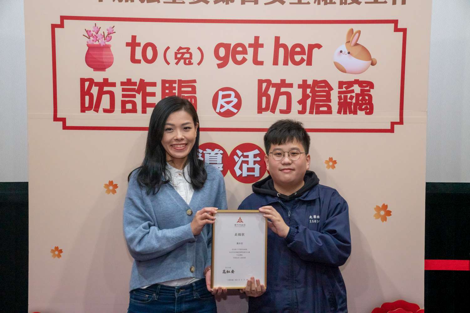圖2:高虹安市長頒發「反詐騙宣導文宣(圖)創作比賽」優秀作品獎狀及獎品。