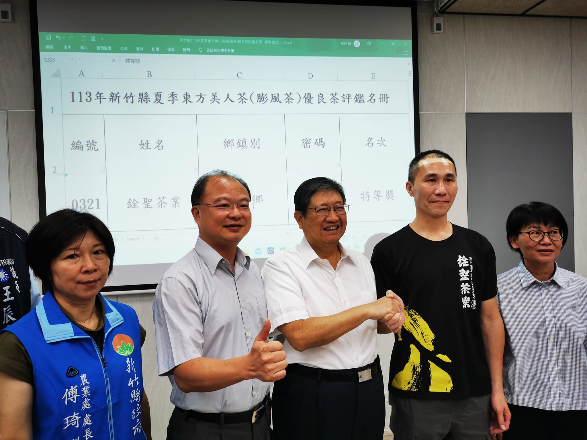 113年度新竹縣夏季東方美人茶(膨風茶)優良茶評鑑於7月15至19日一連5天在北埔鄉農會展開,此次共有1021點參賽,成績7月19日揭曉,由銓聖茶業 奪下特等獎,榮登茶王。新竹縣長楊文科也親自頒獎,感謝茶農的付出,打響東方美人茶的招牌,成為新竹縣享譽國際的最佳伴手禮。