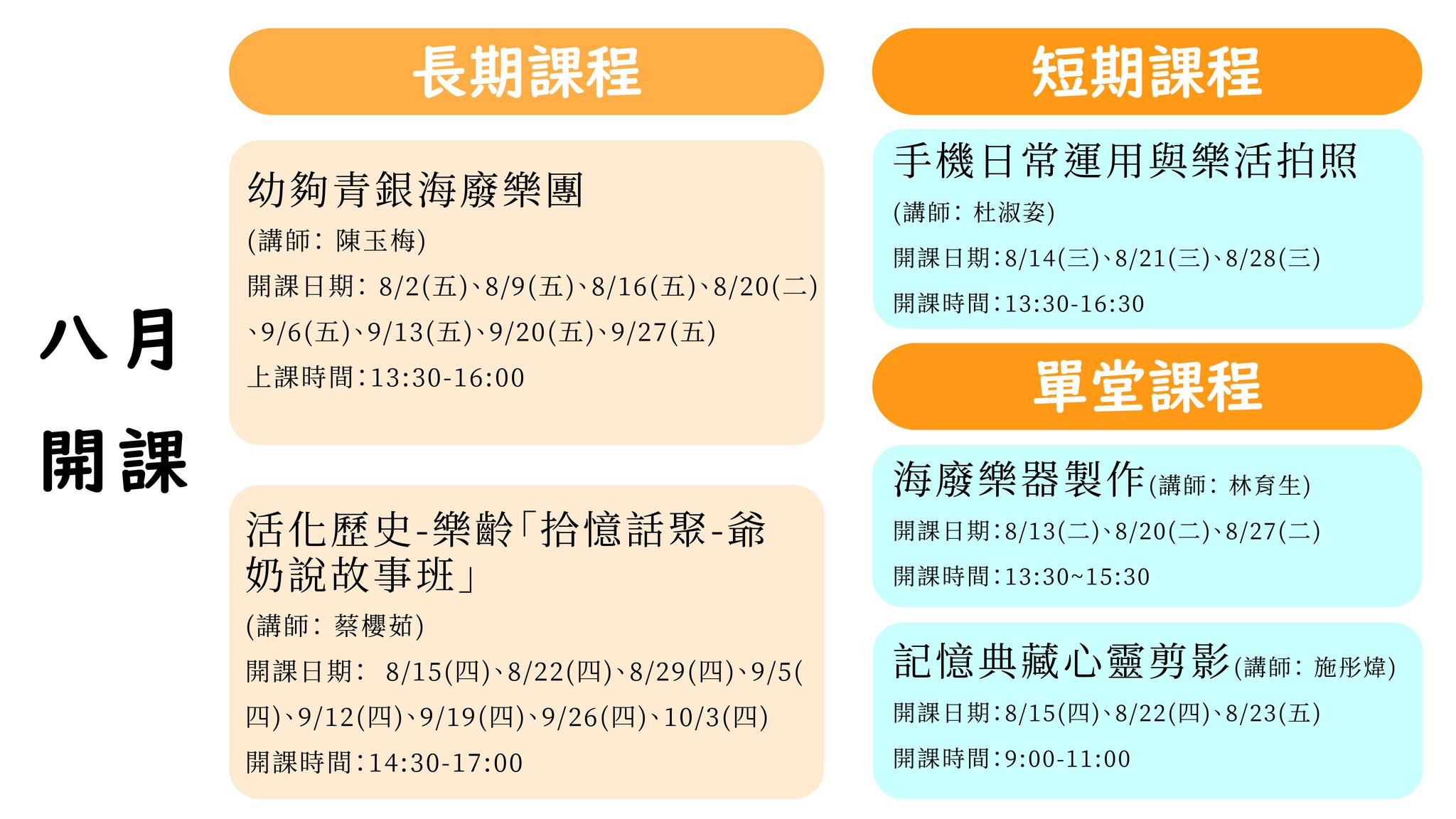八月登場的五門課程有「幼夠青銀海廢樂團」、「活化歷史-樂齡拾憶話聚爺奶說故事班」、「海廢樂器製作班」、「手機日常運用樂活拍照」、「記憶典藏心靈剪影」班。