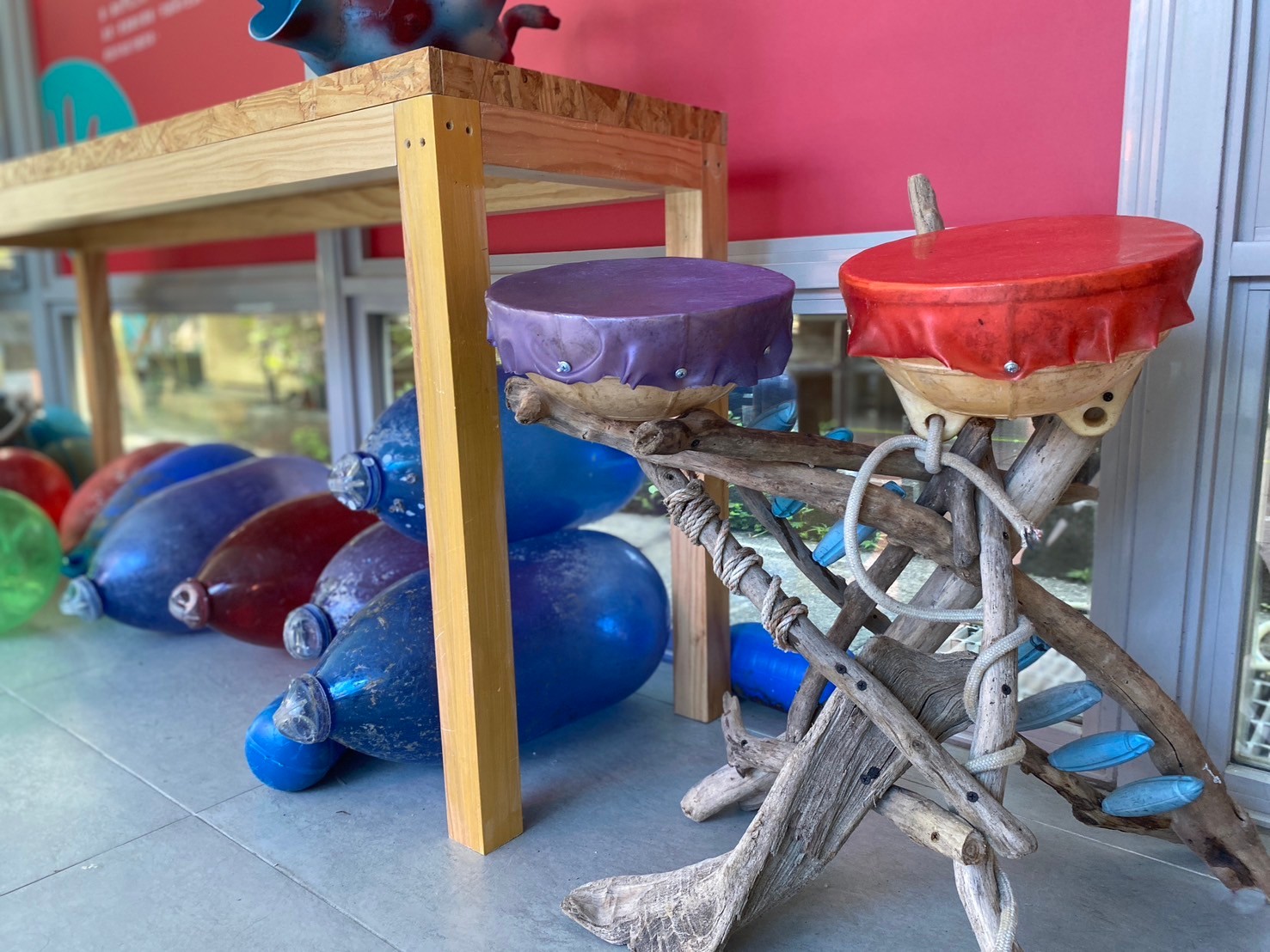 海科館運用這些海廢打造的樂器,情商樂團專業老師及妙音樂劇團開課帶領樂齡者玩音樂,並以「幼夠青銀海廢樂團」帶樂齡者以海廢樂器共學共樂與共玩。