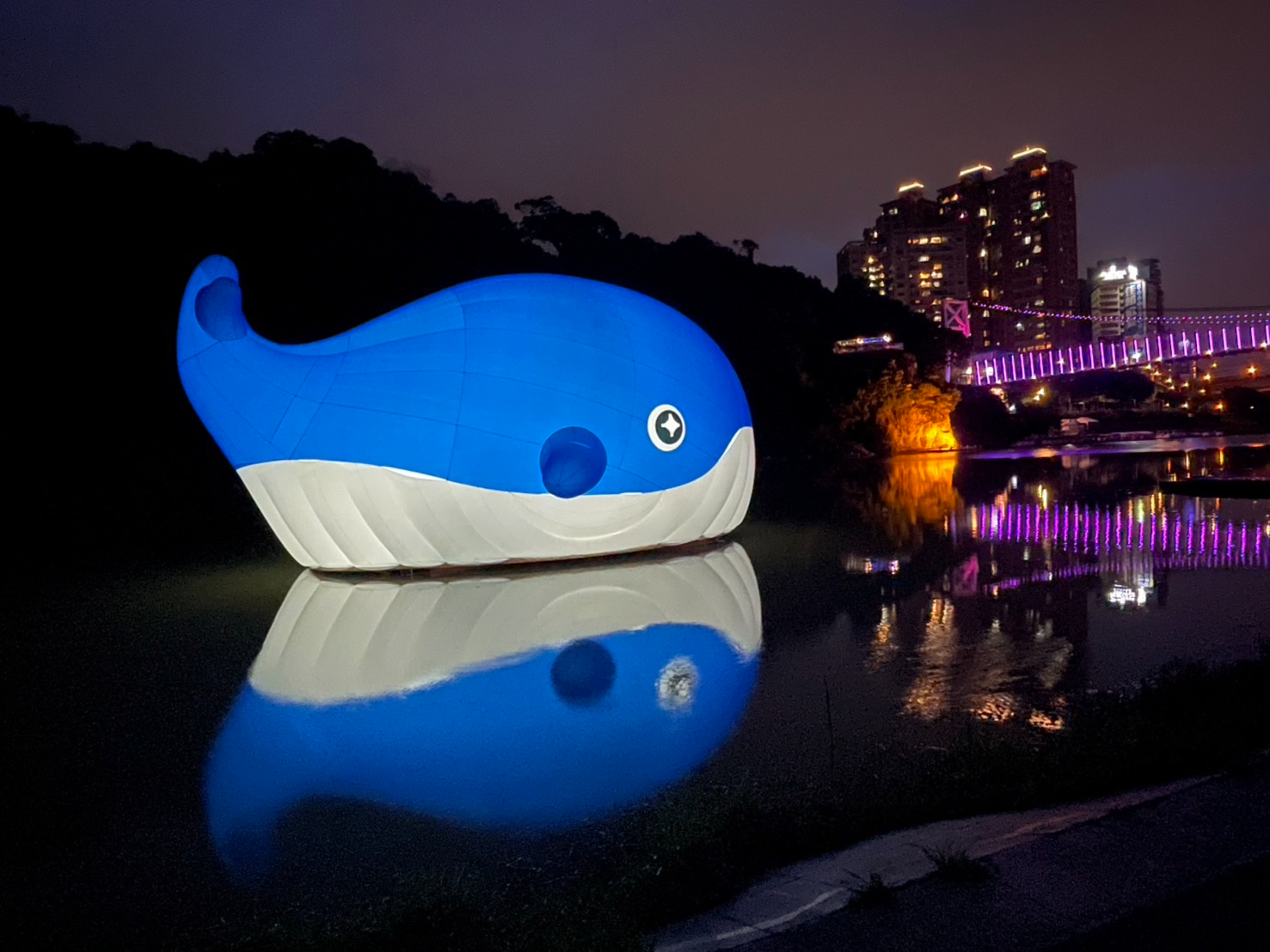 巨型超萌鯨魚晚間6時至10時點燈,在碧潭河岸持續閃耀,為今年夏天最鯨艷的打卡新地標! 圖/新北市政府觀光旅遊局提供