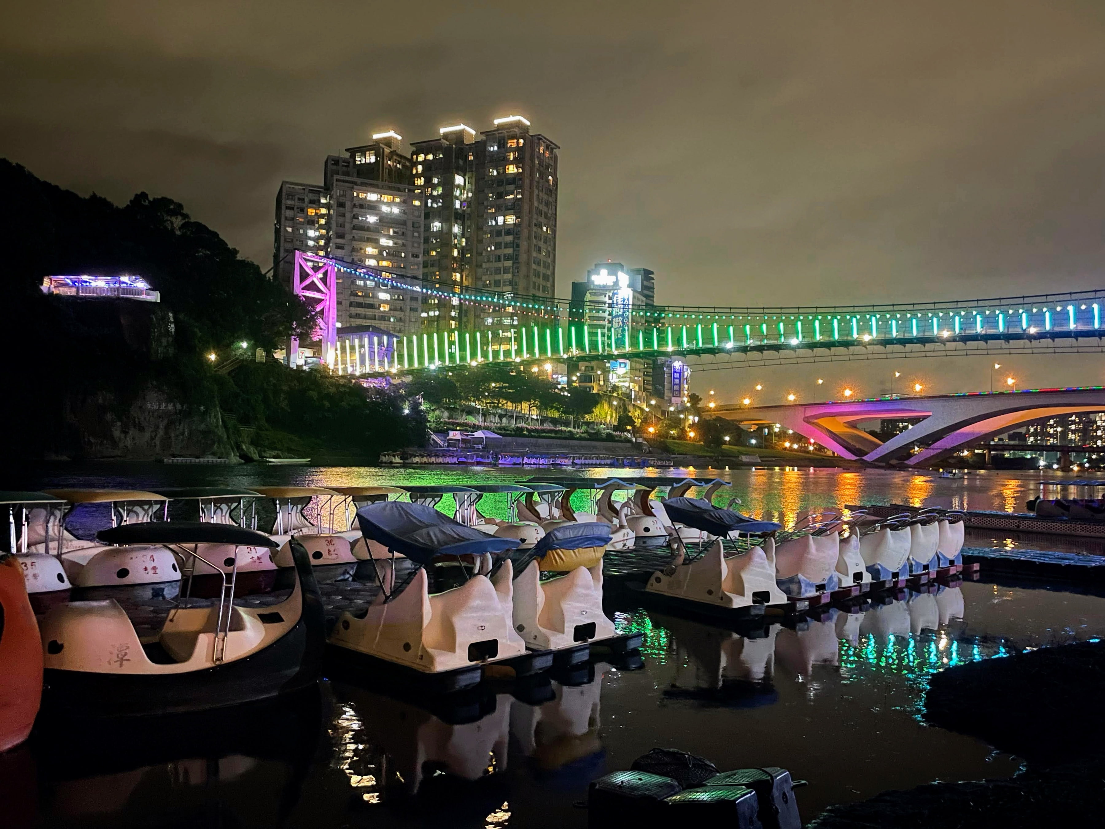 此外,為點綴碧潭夜色之美,碧潭吊橋自8月起釋出全新主題「虹彩絮語」光雕動畫,使整座吊橋猶如一道彩虹劃過夜空,在每日晚間6時至9時,每個整點與半點演出5分鐘,在橋側纜繩上的鋁條燈飾如鋼琴演奏的節奏變化概念,表現緊密且有力度的燈光變換,七彩顏色綿延不斷,搭配超萌噴水鯨魚及燈光秀,在新店溪河岸倒映的優美景緻相互輝映,帶來無限的浪漫遐想。邀請民眾不妨安排碧潭煙火燃放日期,前來碧潭與超萌鯨魚及虹彩吊橋進行鯨彩合影。