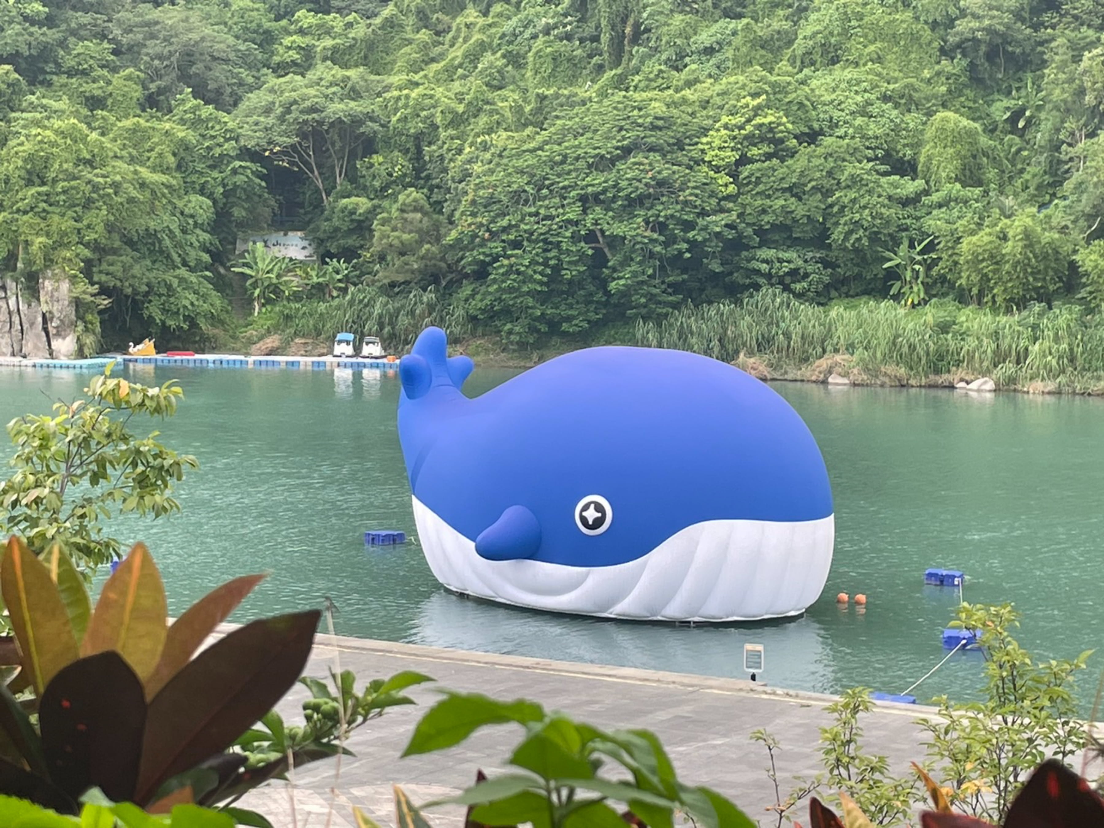 鯨魚裝置在碧潭水面展至8月31日,每日下午3時至晚間9時,每個整點與半點展示超萌噴水表演 圖/新北市政府觀光旅遊局提供