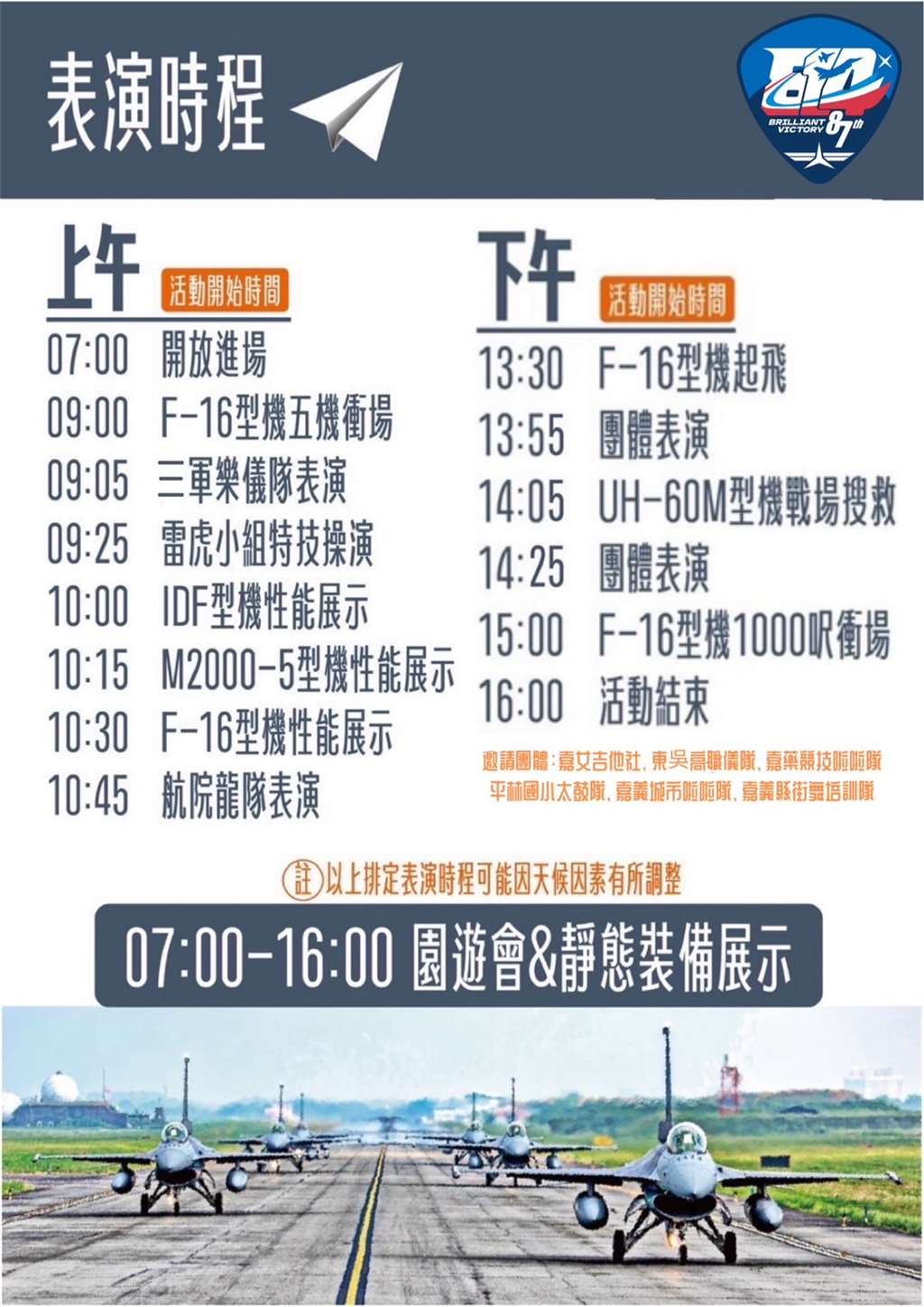 活動項目:雷虎小組特技表 演、各型主力戰機性能展示、F-16V型機編隊衝場、三軍儀隊暨三軍軍樂隊、地面靜態裝備陳展、園遊會等活動。