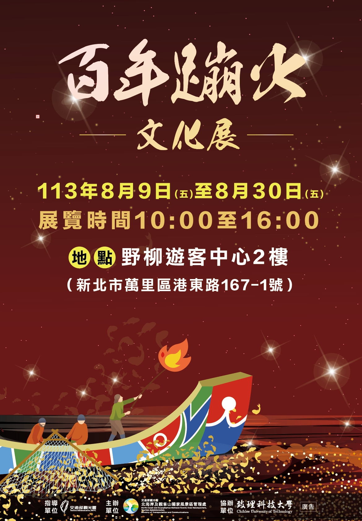 交通部觀光署北海岸及觀音山國家風景區管理處(以下稱北觀處)為了傳承百年蹦火漁業這項寶貴文化資產,於8月9日(五)至8月30日(五)在野柳遊客中心2樓舉辦「百年蹦火文化展」,展覽時間為每日上午10時至下午4時。每周六、日現場將有志工導覽解說以及專人翻譯,民眾還可參加北觀粉絲團抽獎與打卡送禮活動,參加就有機會獲得蹦火周邊精緻好禮。