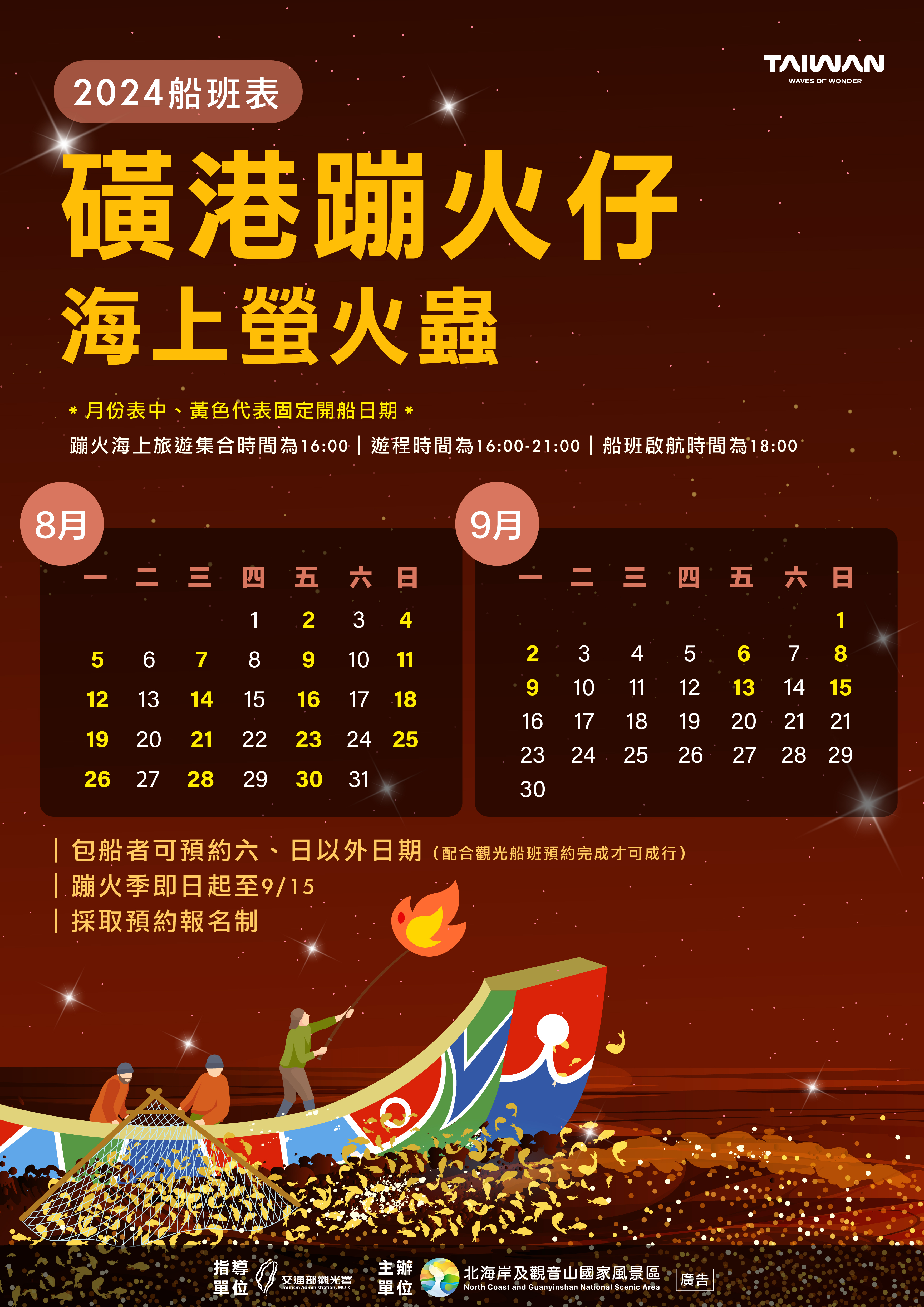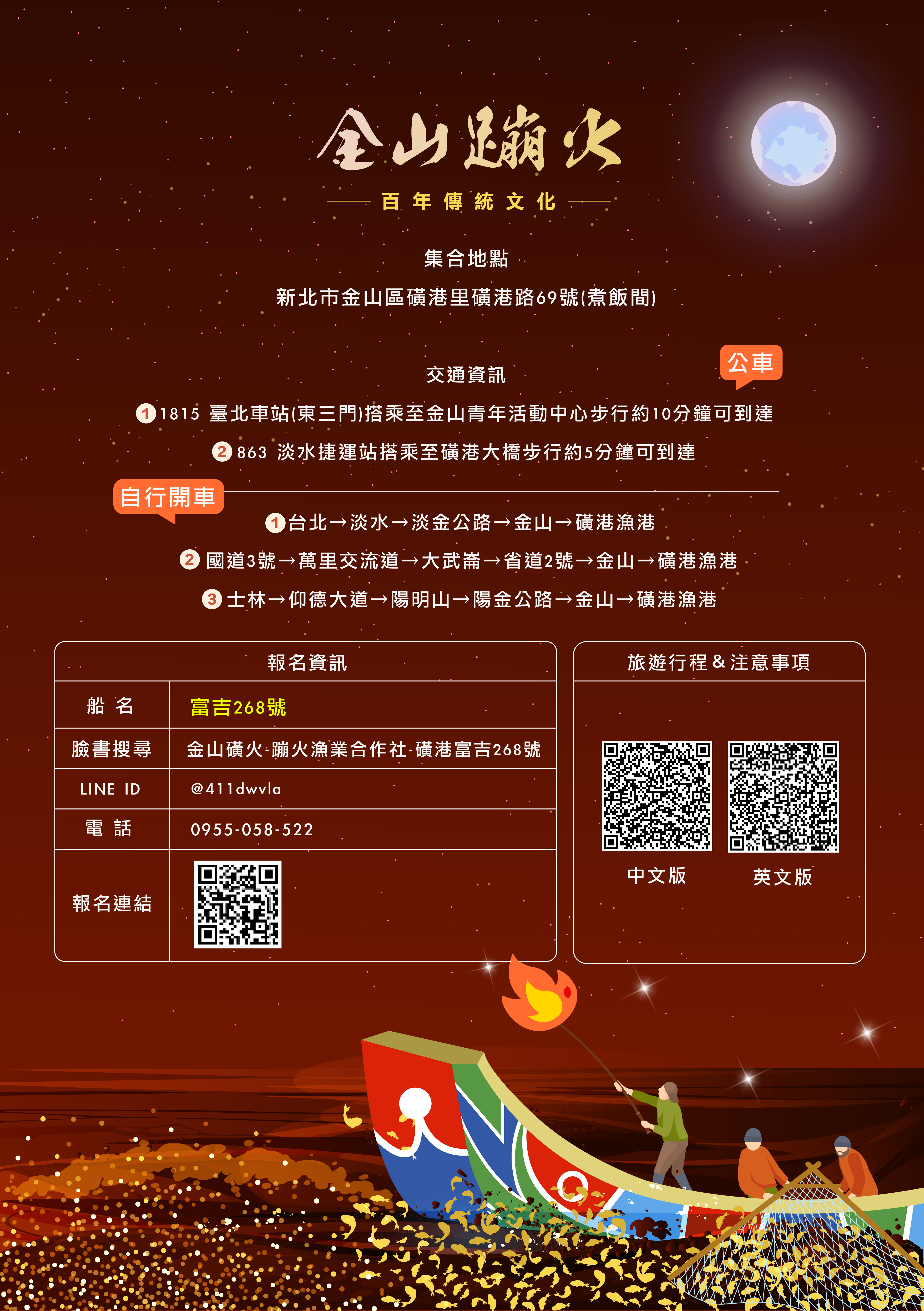 北觀處今年也透過「富吉268號」與新成員「鴻昌168號」推出定時可預約的精彩豐富蹦火主題海陸行程,讓民眾不但能近距離欣賞北海岸夏夜最璀璨的漁火,還能探訪磺港漁村,同時遊覽魚路古道、蹦火體驗DIY,讓這即將失傳的漁業文化,透過有趣多元的蹦火主題行程,能夠讓更多旅客了解及認識在地特色產業文化,來趟深度的體驗旅遊。