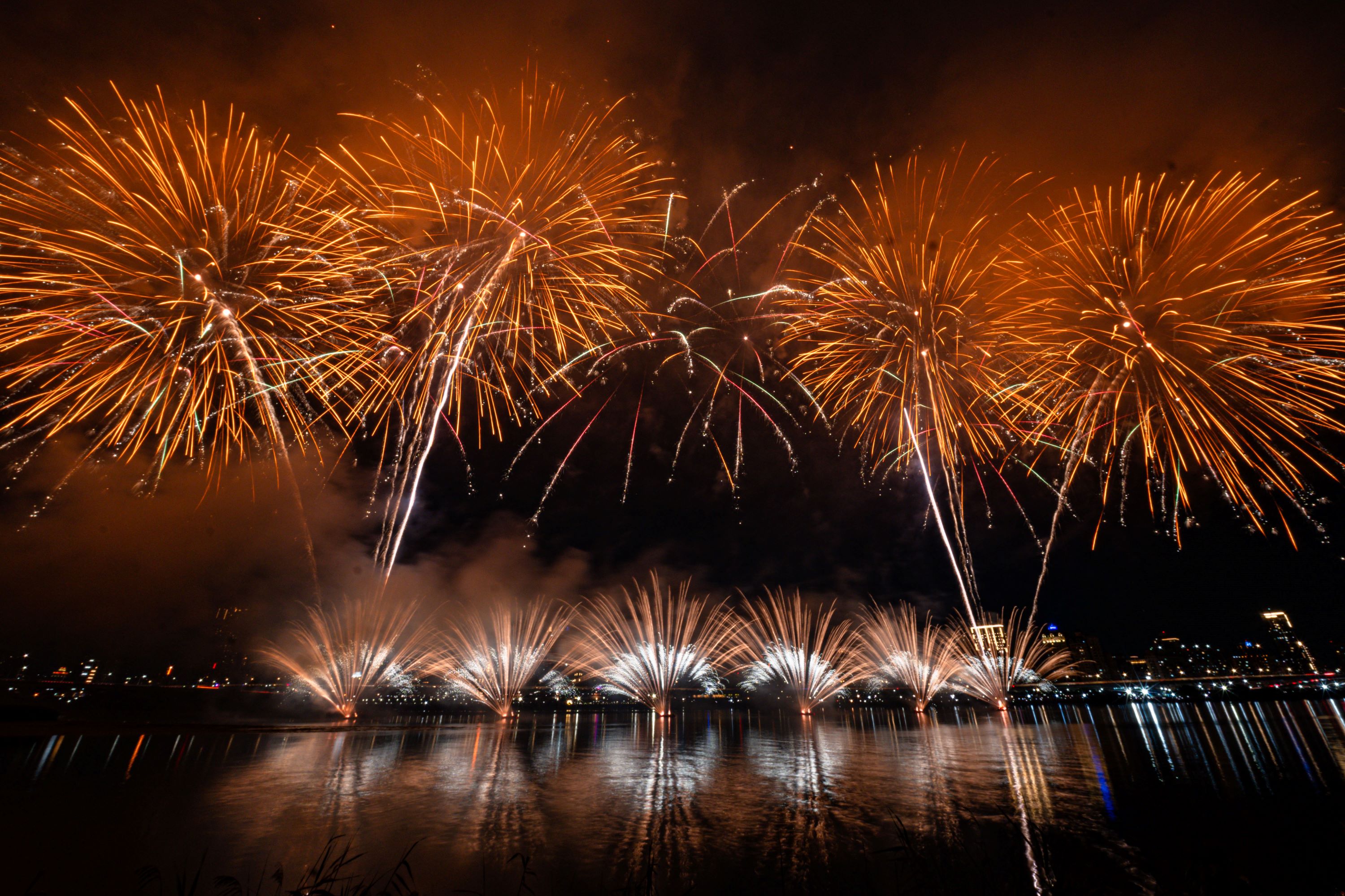 主題煙火透過金、銀色的煙火交織,演繹大稻埕的歷史文化。圖/臺北市政府觀傳局提供