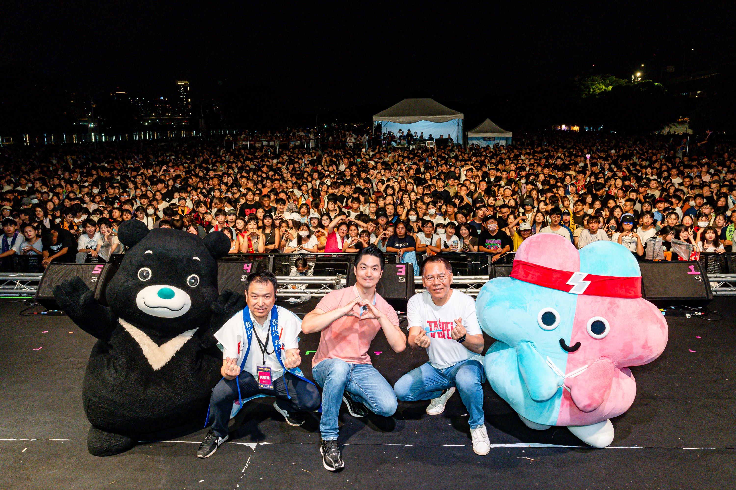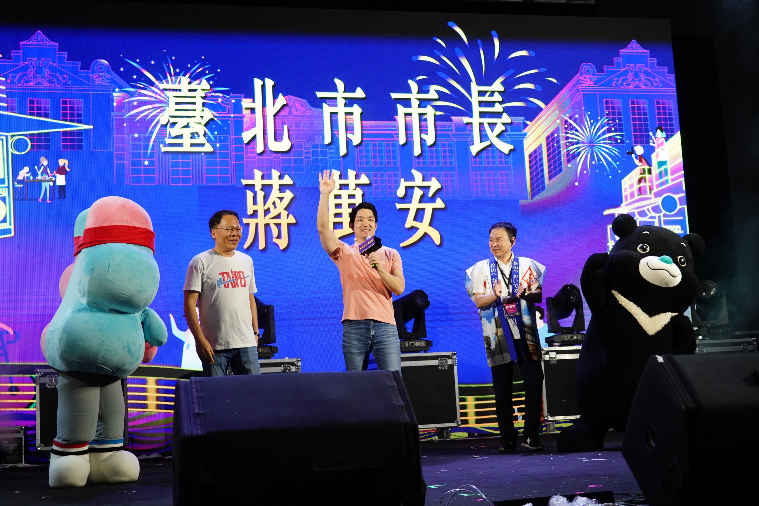 臺北市長蔣萬安、觀傳局長王秋冬及日本愛媛縣松山市松本善雄參與,與臺北市吉祥物熊讚、世壯運吉祥物壯寶,到現場和民眾一同賞煙火 圖/臺北市政府觀傳局提供