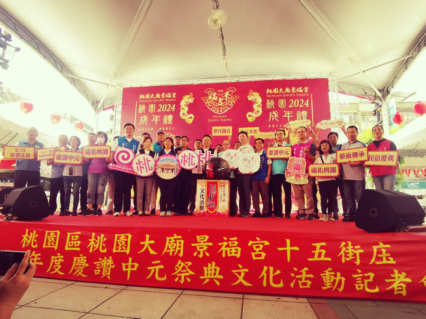 桃園區公所表示,景福宮中元祭典文化活動8月17日啟動,將結合桃園區9大姓氏宗親、景福宮桃園15街庄中元慶典及市府等共10部水燈排車進行遶境,並於晚上9時於成功橋南崁溪畔放水燈。此外,景福宮18日下午5時將舉行中元普渡,普渡後部分讚普供品將贈予弱勢團體,實踐社會公益精神。