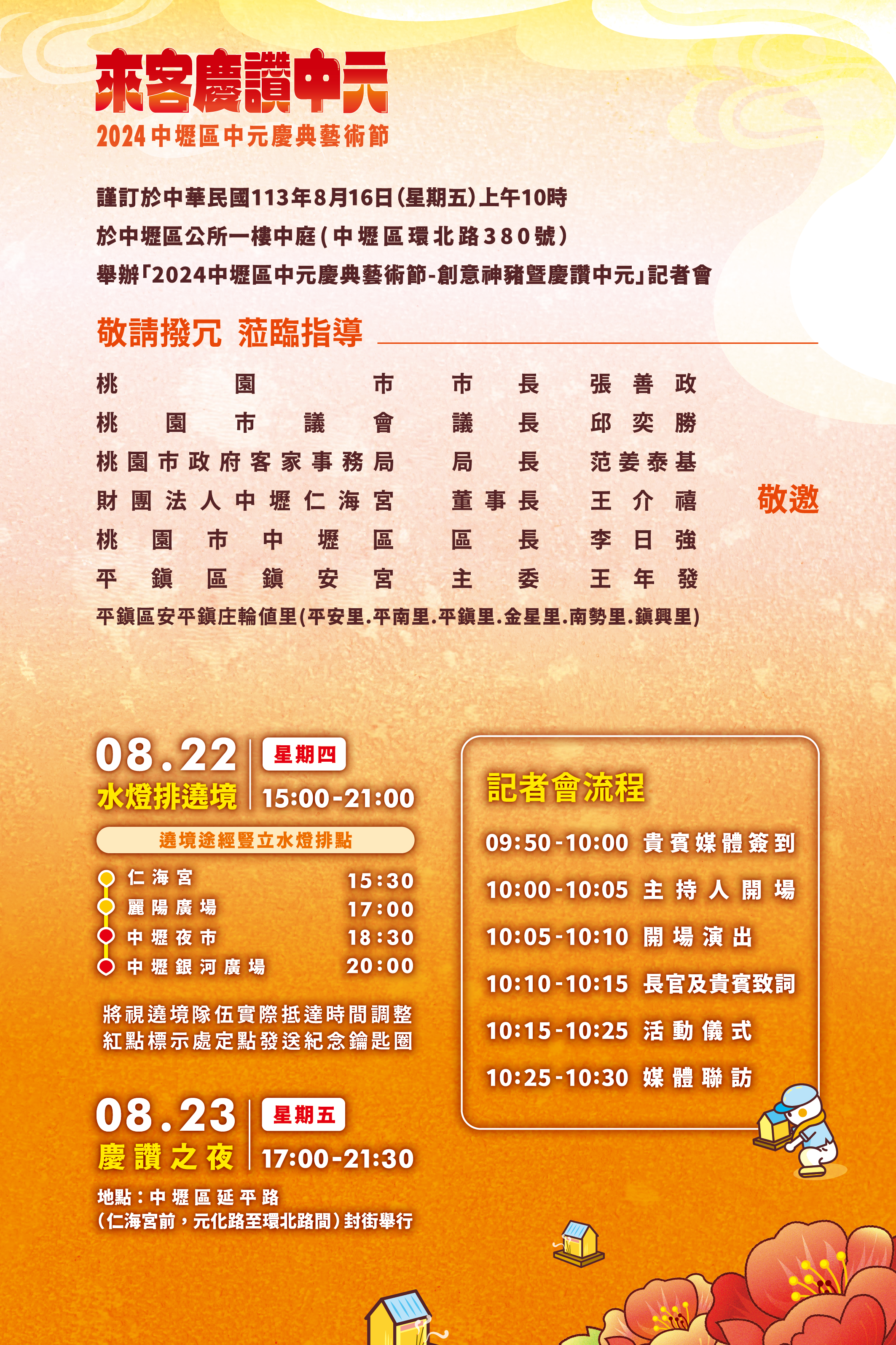 於8月16日上午 10 時於中壢區公所一 樓中庭舉辦記者會。活動由桃園市政府客家事務局、中壢區公所與輪值里平鎮區安平 鎮庄,包括平鎮里、鎮興里、金星里、平安里、平南里及南勢里以及中壢在地指標性 廟宇仁海宮共同舉辦。
