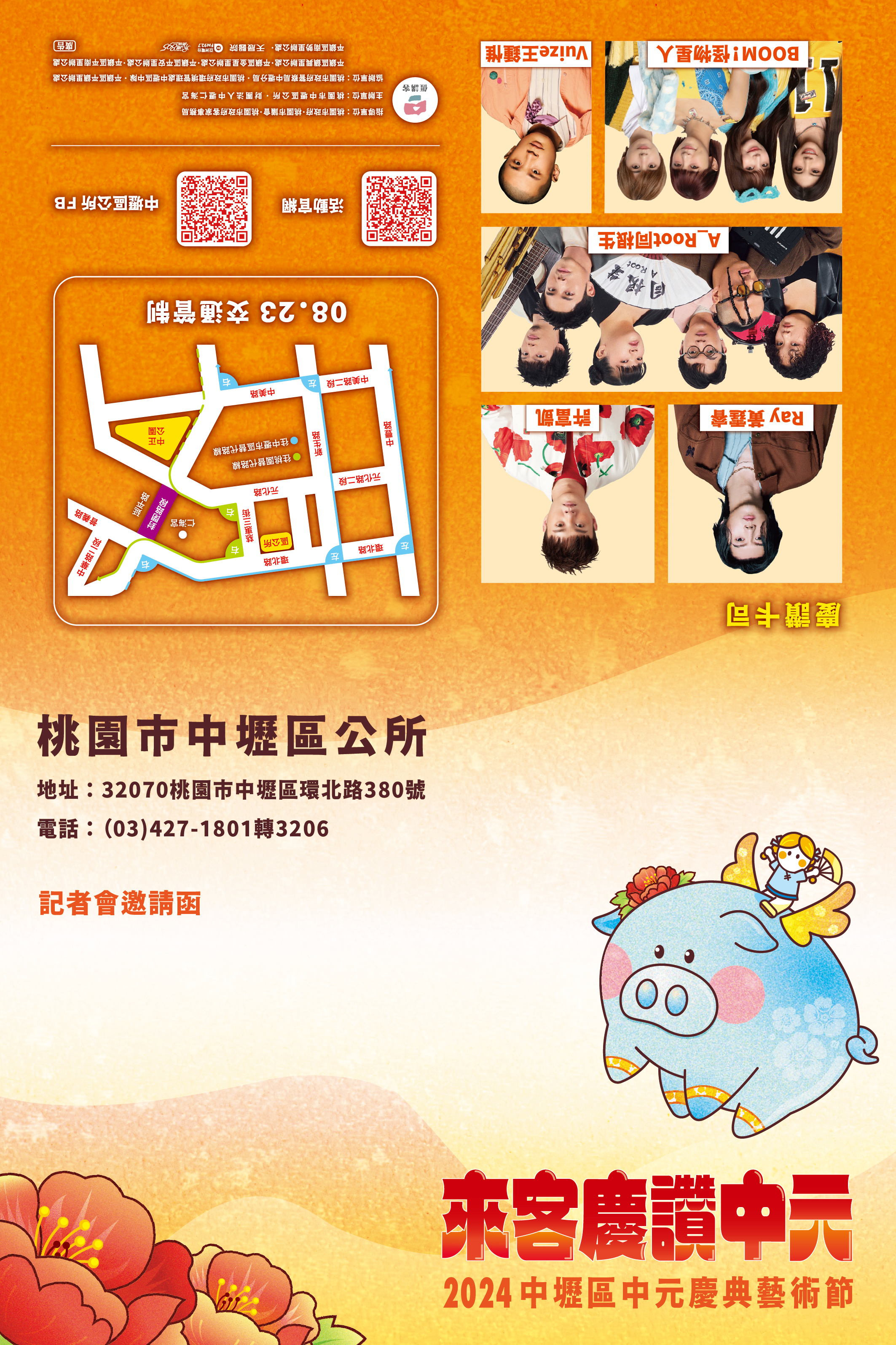 8 月 23 日(星期五)慶讚之夜在中壢仁海宮前延平路(環北路到元化路間)封街 舉辦,陣容卡司更為豐富精彩。新生代人氣歌手 Ray 黃霆睿、金曲獎入圍客家饒舌歌 手 Vuize 王鍾惟、客家樂團 A Root 同根生、金曲台語歌王許富凱、創作型女團 Boom!怪物星人將帶來熱力四射的演出。周邊還有創意神豬裝置藝術、親子 DIY 體 驗、客家闖關遊戲及歡樂大摸彩,現場設置客庄、美食市集,吃喝玩樂一應俱全,千 萬不要錯過。 桃園市政府表示,本次活動是社區、宗教寺廟與地方團體齊心協力的成果,旨在 弘揚在地特色、民俗傳統與客家文化底蘊,讓民眾更深入了解客家中元節的習俗,期 望更多人能重視與認同客家文化。