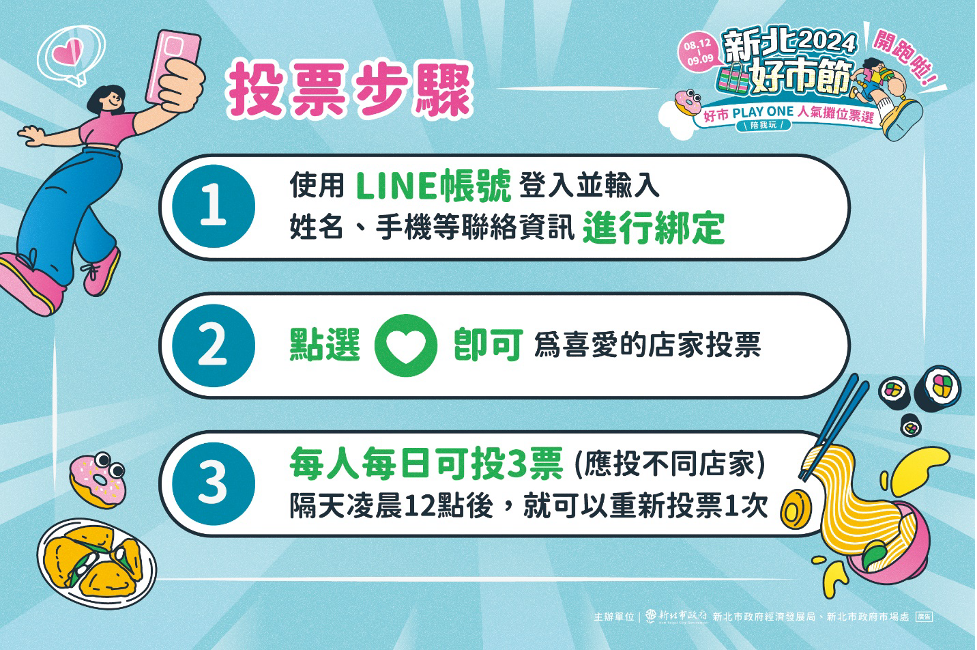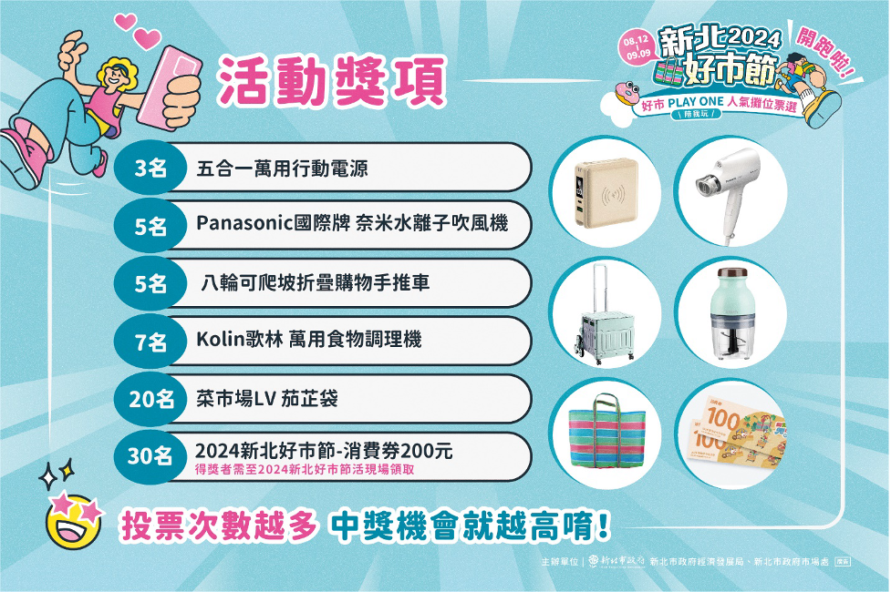 市場處補充,今年新北好市節將透過人氣攤位票選方式選出30家人氣攤商,民眾可以到票選網站進行投票,除了能支持喜愛的市場攤商外,還可以參加抽獎活動,獎品包含行動電源、吹風機及購物手推車等精選生活好物,你選攤商我們選好物送給您,投票時間自即日起至9月9日截止,每人每日可以投給3個不同攤商,投票次數越多,中獎機會就越大哦!