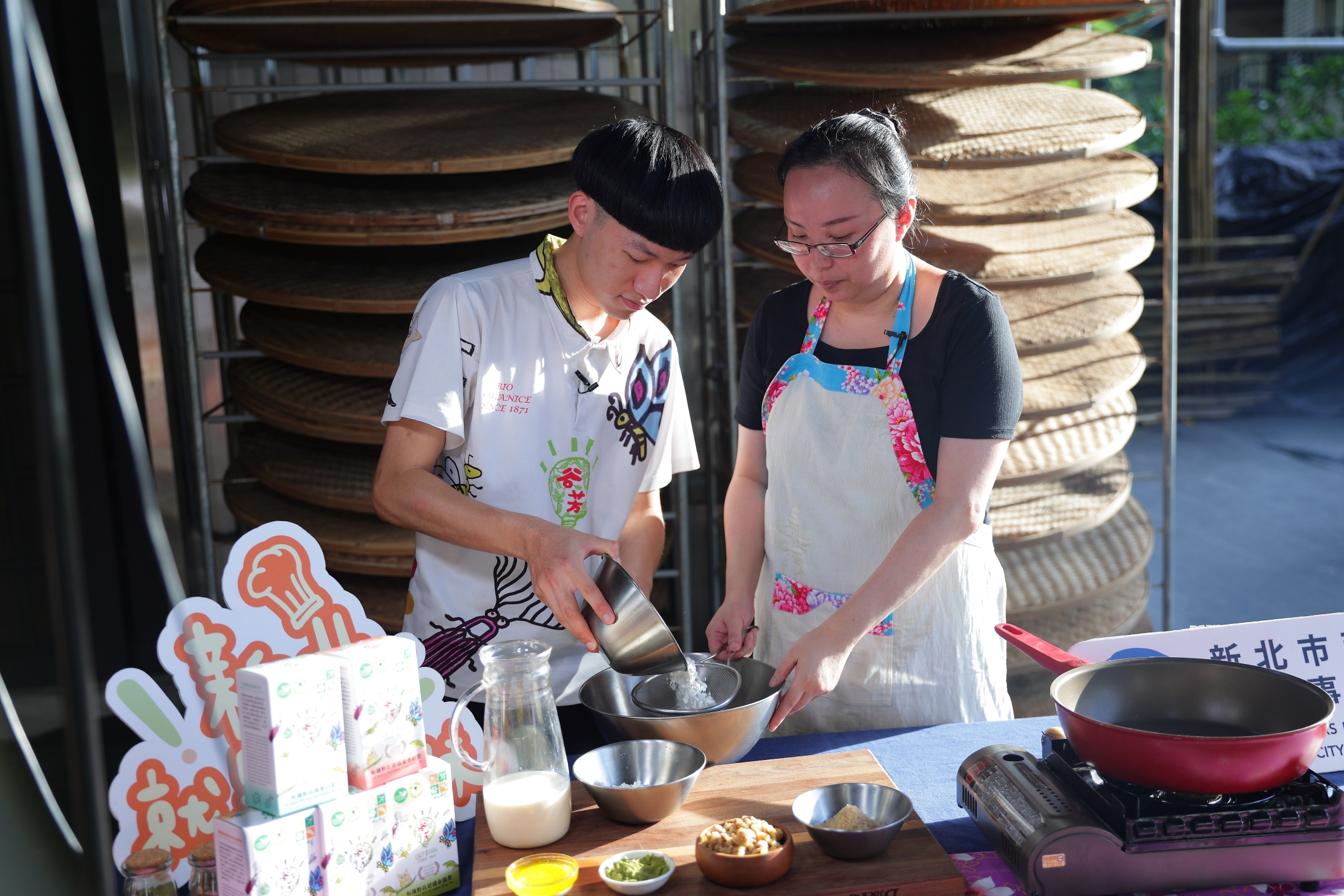 ㄚ樺媽媽(左)於新北市客家文化園區客家美食主藝餐廳拍攝「新北就是哈這味(位)」共同製作蜂蜜茶點。圖/ 新北市政府客家事務局提供