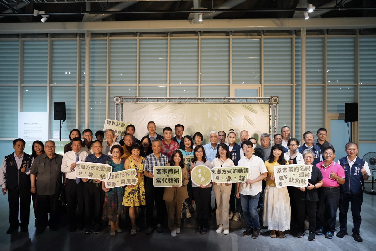 圖說1.: 與會嘉賓大合照 (照片提供/可睿創意) 「客語-客家飲食視覺語彙當代藝術展」,邀請7組藝術創作者:巫雲鳳、洪譽豪、彭賢祥、温珮彤、程仁珮、鄧雯馨、張芳慈x光試所,展開豐富的客語詞彙探尋之旅。創作者來自當代藝術家、新媒體創作者、客籍詩人、客家媳婦、閩南人等身分,透過不同族群的視角,探索客家飲食文字語彙、視覺語彙、聲音蒐集、客家傳統市場影像語彙及新客家移居者融合多民族的飲食文化,並就客家人在移居過程中如何與他者交流、及移居者進入客家脈絡中如何交融等面向進行闡述,將錄像、聲音、複合媒材、裝置、文字及詩文等藝術創作,融合成7趟引人入勝的飲食詞彙探尋之旅。