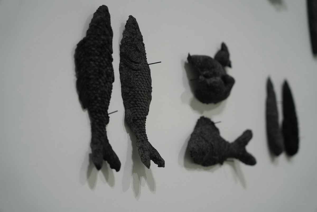 藝術家巫雲鳳作品《漁港的滋味》結合海鮮食物影像、刺繡、軟雕塑,以海產風貌回應不同生活地域的嗅覺與味覺經驗,並以《帶著便當去旅行》隱喻離鄉多年對於身份認同的思考。