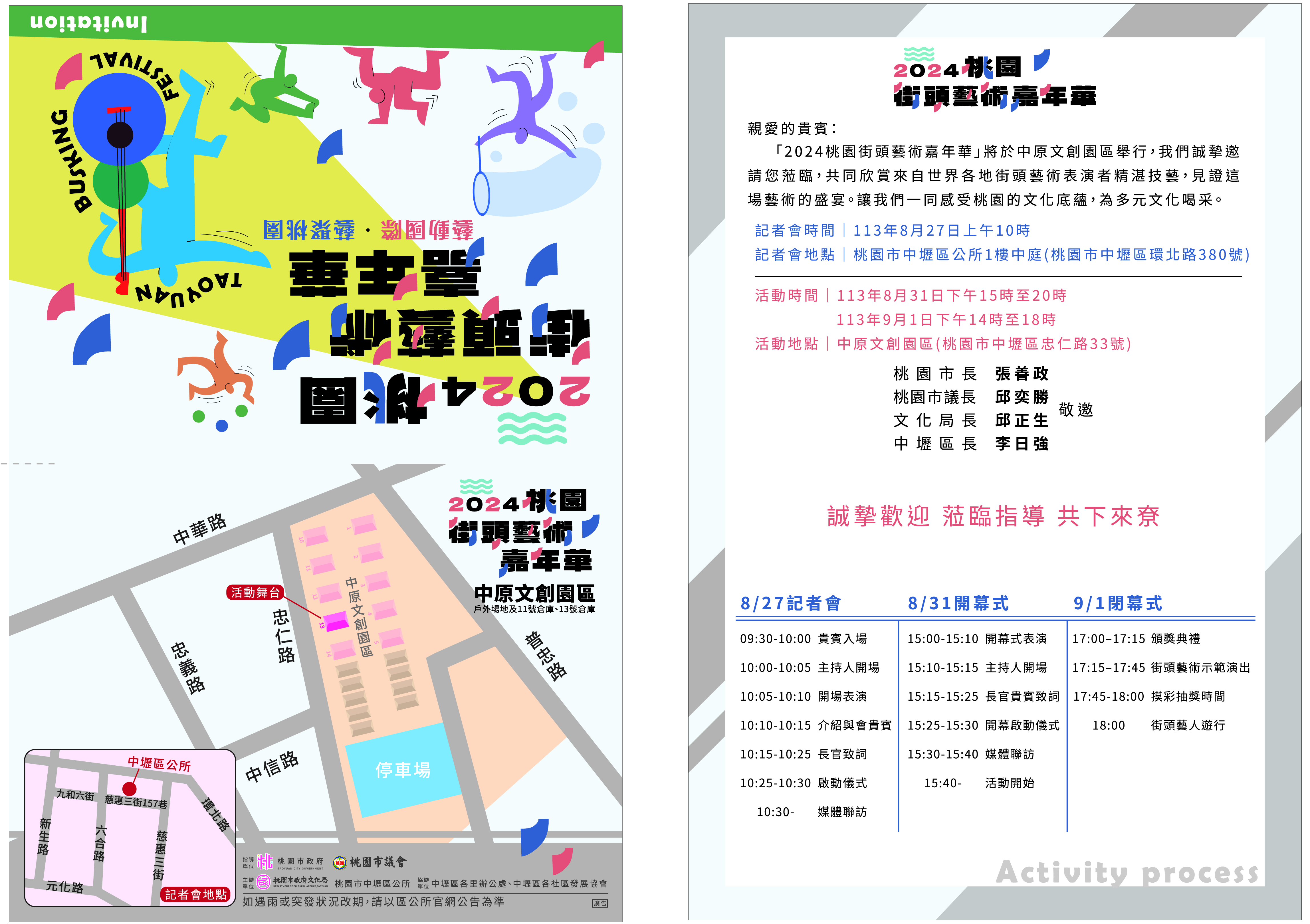 2024桃園街頭藝術嘉年華,將在8月31日、9月1日熱鬧登場,8月27日上午於中壢區公所舉行記者會。現場邀請到韓國知名街頭藝術家KIM以及Masker 瑪斯克街舞藝術團隊帶來精彩的開場表演,以「藝境輪舞」作為啟動儀式象徵著藝術領域的多元和動感,隨著摩天輪的旋轉,桃園的街頭藝術將綻放出無限的可能與光彩,並宣告「2024桃園街頭藝術嘉年華」正式起跑,邀請民眾8月31日、9月1日一起到中原文創園區欣賞桃園街頭藝術的風采。