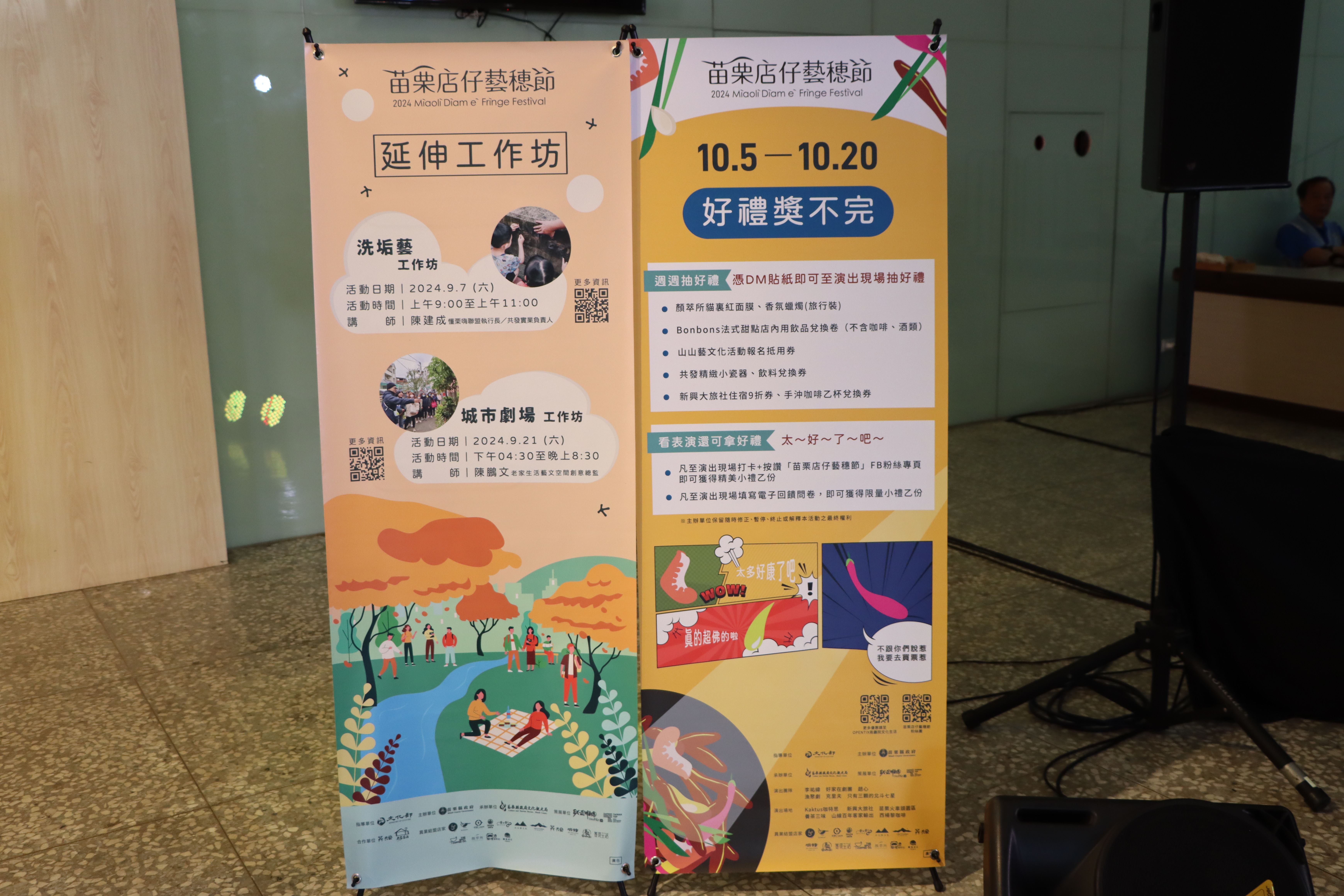苗栗縣政府舉辦「2024苗栗店仔藝穗節」提升在地藝文特色與聲量,今年特別規畫到外鄉鎮市演出,10月5日起至10月20日匯集6個表演藝術團隊,將至縣內6間店家演出16場次,邀請民眾共同探索苗栗藝術與生活相互融合的多元實踐。