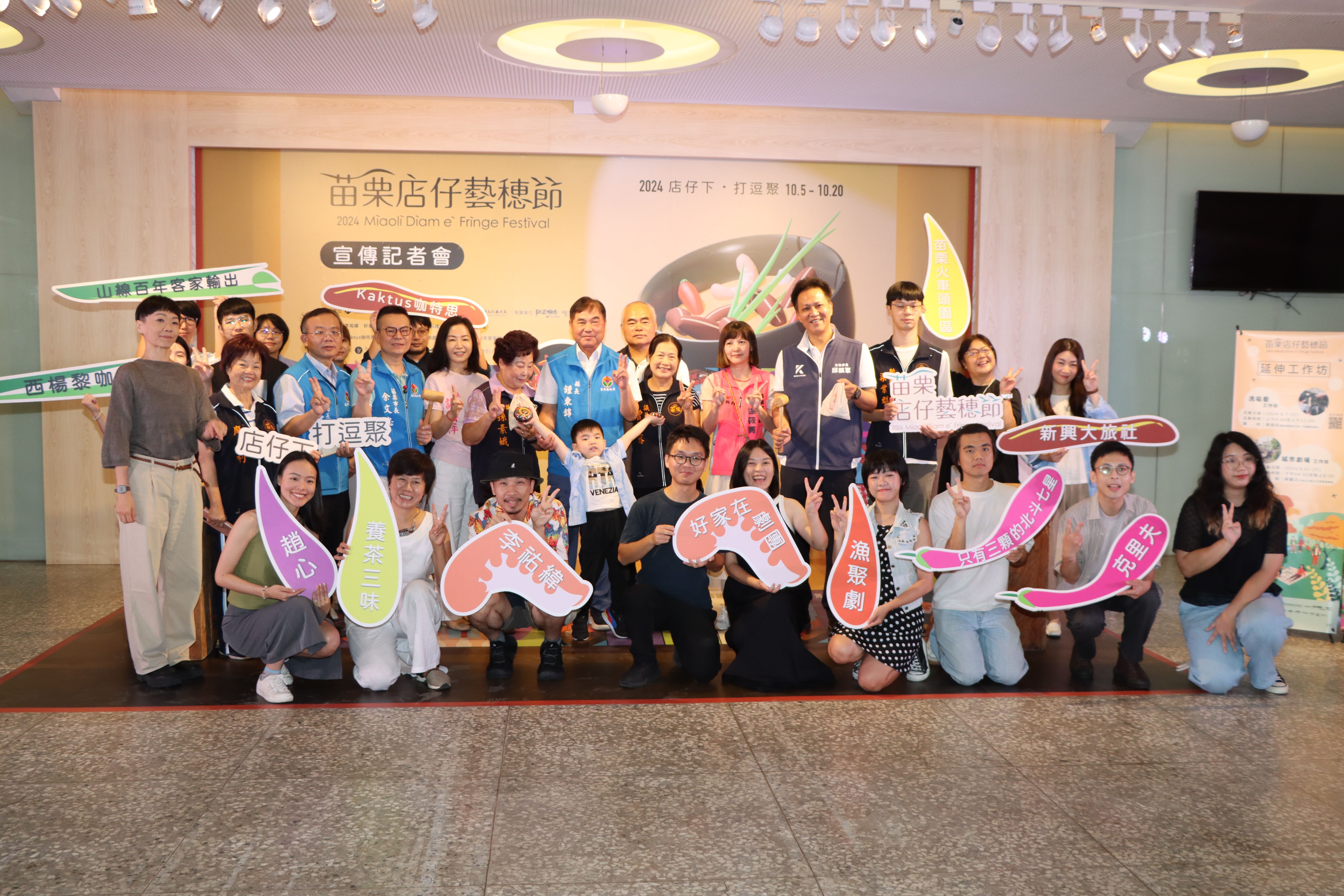 27日苗栗縣長鍾東錦、立委邱鎮軍、議長李文斌秘書李文星、議員許櫻萍、廖英利、孫素娥、曾美露、徐筱菁、張志宇助理、苗栗市長余文忠以及地方民意代表等人,共同啟動2024苗栗店仔藝穗節,邀請民眾共同探索藝術與生活相互融合的多元實踐。