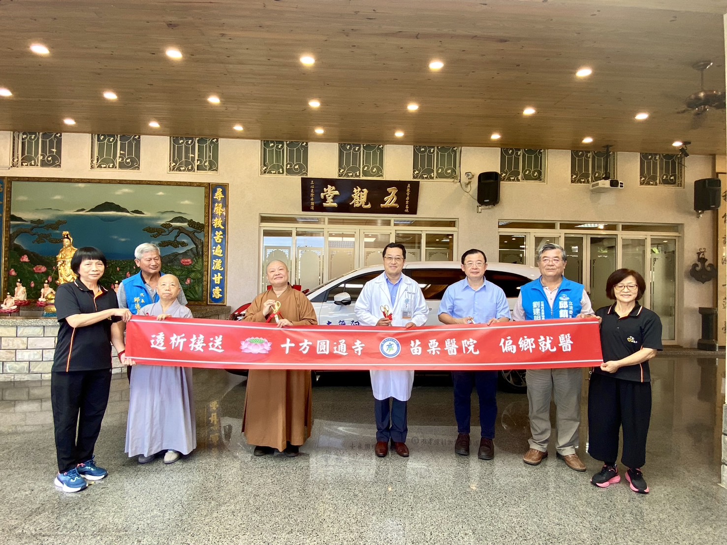 關懷偏鄉長者生命與健康,社團法人苗栗縣十方圓通寺護持會捐贈衛生福利部苗栗醫院一輛七人座汽車,期能為交通不便的偏鄉,提供醫療交通服務,增進長者健康照護。捐車儀式於8月28日日上午在十方圓通寺舉辦,十方圓通寺道晟師父特別致詞開示並為車輛進行祈福護持,祈願大家法喜充滿、交通服務車出入平安。部苗院長徐國芳致贈感謝狀並致詞表示,很高興代表院方和民眾獻上由衷的感謝與敬意,未來也一定會善用、發揮此匯集愛心車輛的效能,並將會盡一切力量,持續提供偏鄉民眾連續性完整的醫療服務。