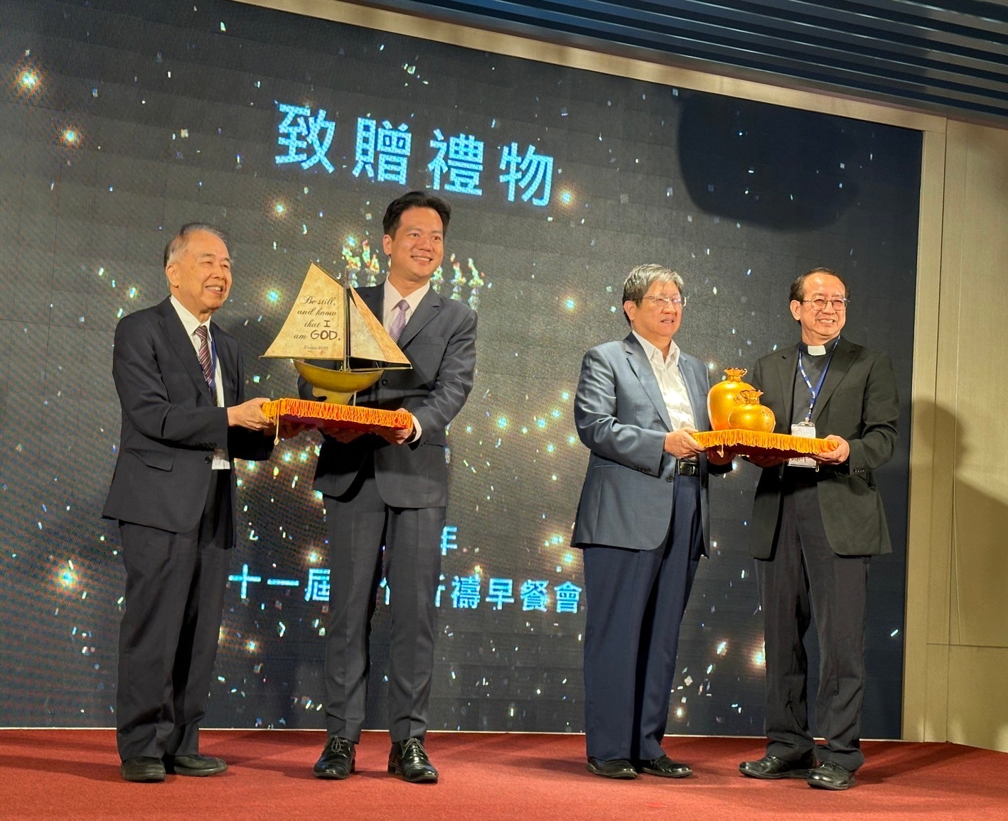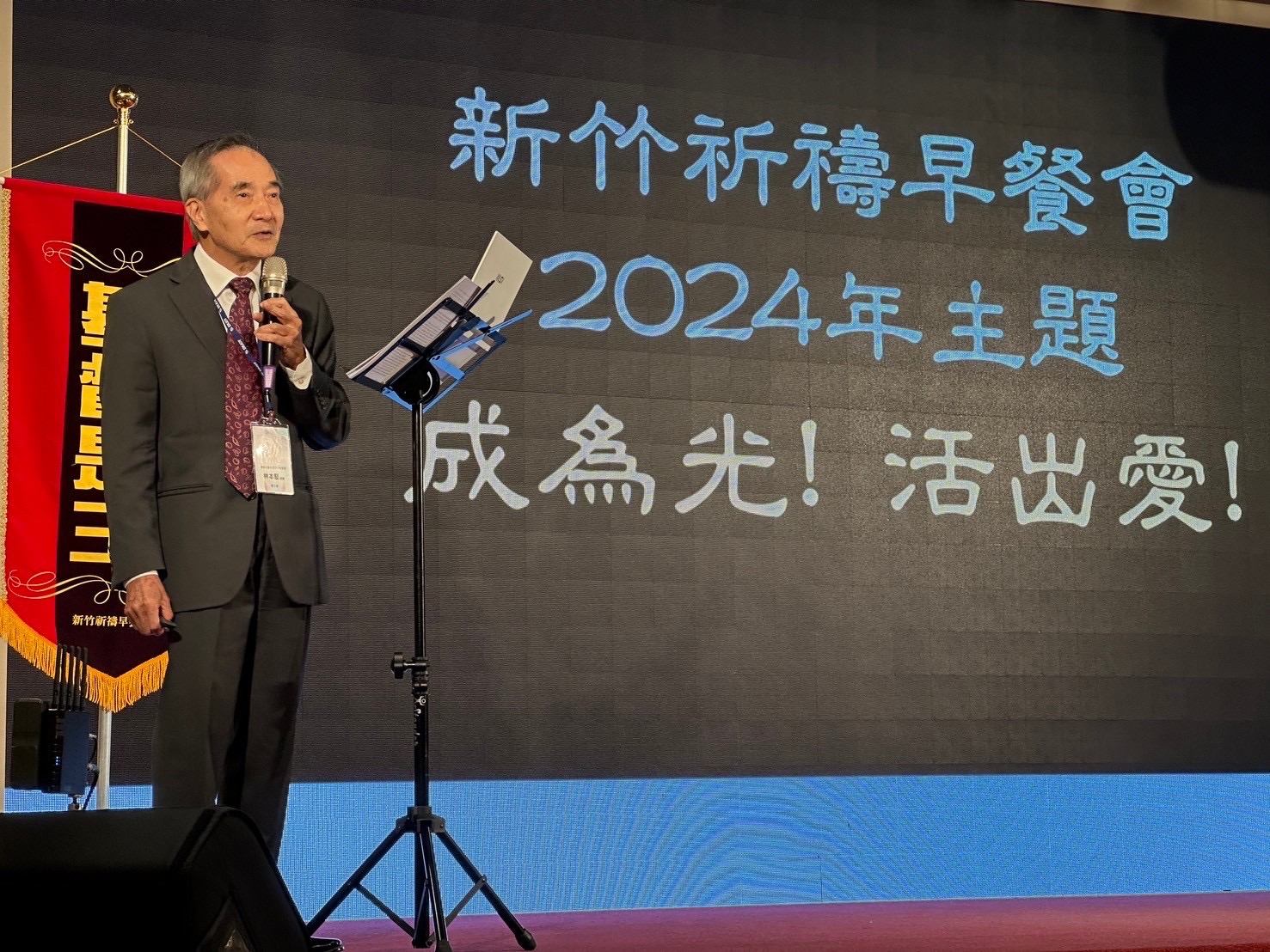 新竹市邱臣遠市長致詞時指出,貿易戰與區域戰爭、極端氣候等,挑戰只有愈來愈多,祈禱早餐會對各方面的禱告都非常具體,也讓他很感動。期望藉由祈禱早餐會,把耶穌的愛活出來,也將主耶穌基督的恩典一步步傳遞下去。