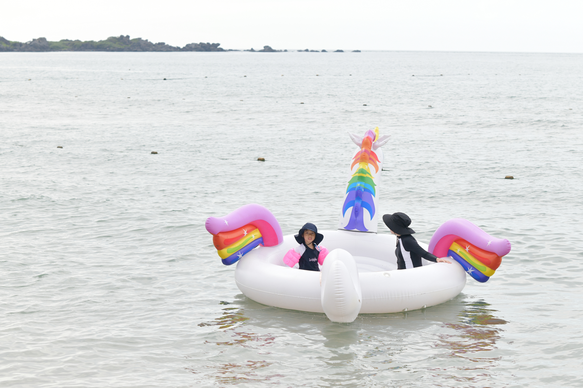 白泡泡樂園與救生團體合作,分享民眾水域安全救生的觀念和方式,有參與家長表示,這樣的內容讓他們可以放心的帶著孩子來海邊戲水,更認同水域安全宣導的重要性,當然課程結束後的戲水遊具,最讓大家期待。超大的獨角獸造型泳圈,是沙灘上最搶手的遊具之一,不管是大人還是小孩,躺在泳圈裡,漂浮在海上,真的沒有最CHILL,只有更CHILL啊~