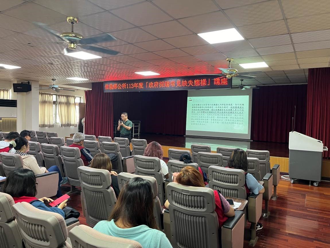 為提升信義鄉公所同仁辦理政府採購業務的專業知能,避免同仁在辦理採購業務過程誤觸圖利陷阱,南投縣信義鄉公所政風室於9月2日邀請到縣府採購稽核小組的陳俊任委員來到公所宣講「政府採購常見缺失態樣」課程。