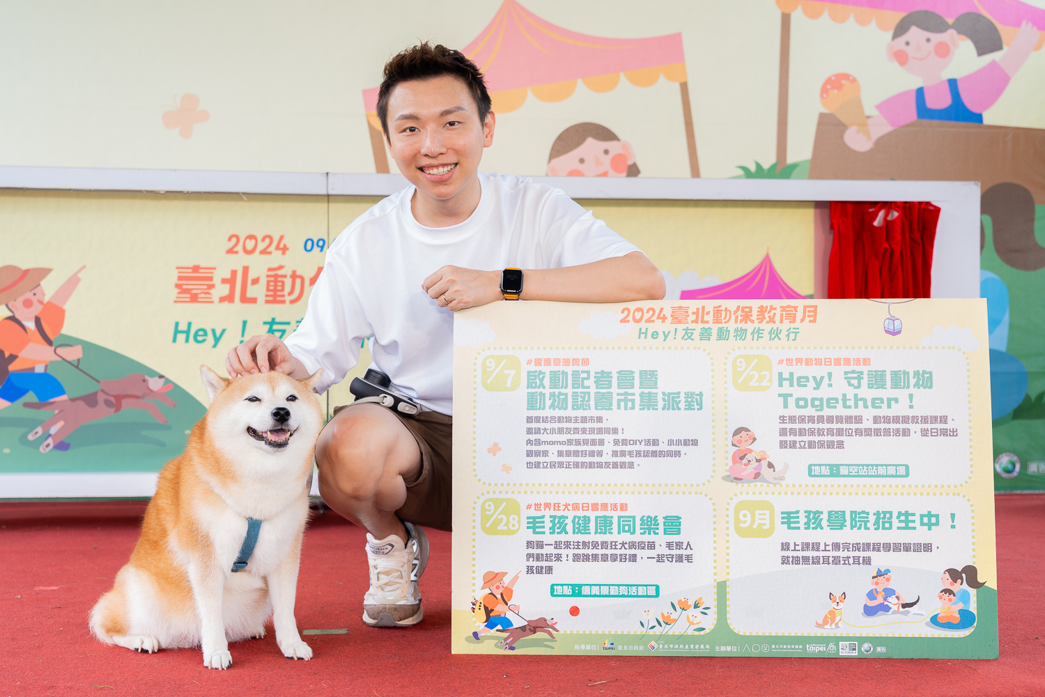臺北市政府自9月7日起至10月4日止特別以「Hey!友善動物作伙行」為主題舉辦「臺北動保教育月」系列活動。首場活動響應臺灣狗節,在臺北市動物之家中繼園區首度結合美食市集攤位,舉辦「2024臺北動保教育月啟動記者會暨動物認養市集派對」,寵物網紅「柴犬Nana和阿楞的一天」也在現場宣傳推廣,臺北市政府產業發展局吳欣珮副局長與小朋友一同學習幫狗狗繫上胸背帶及牽繩走秀,呼籲落實正確犬隻外出防護方式並推廣動物認養。