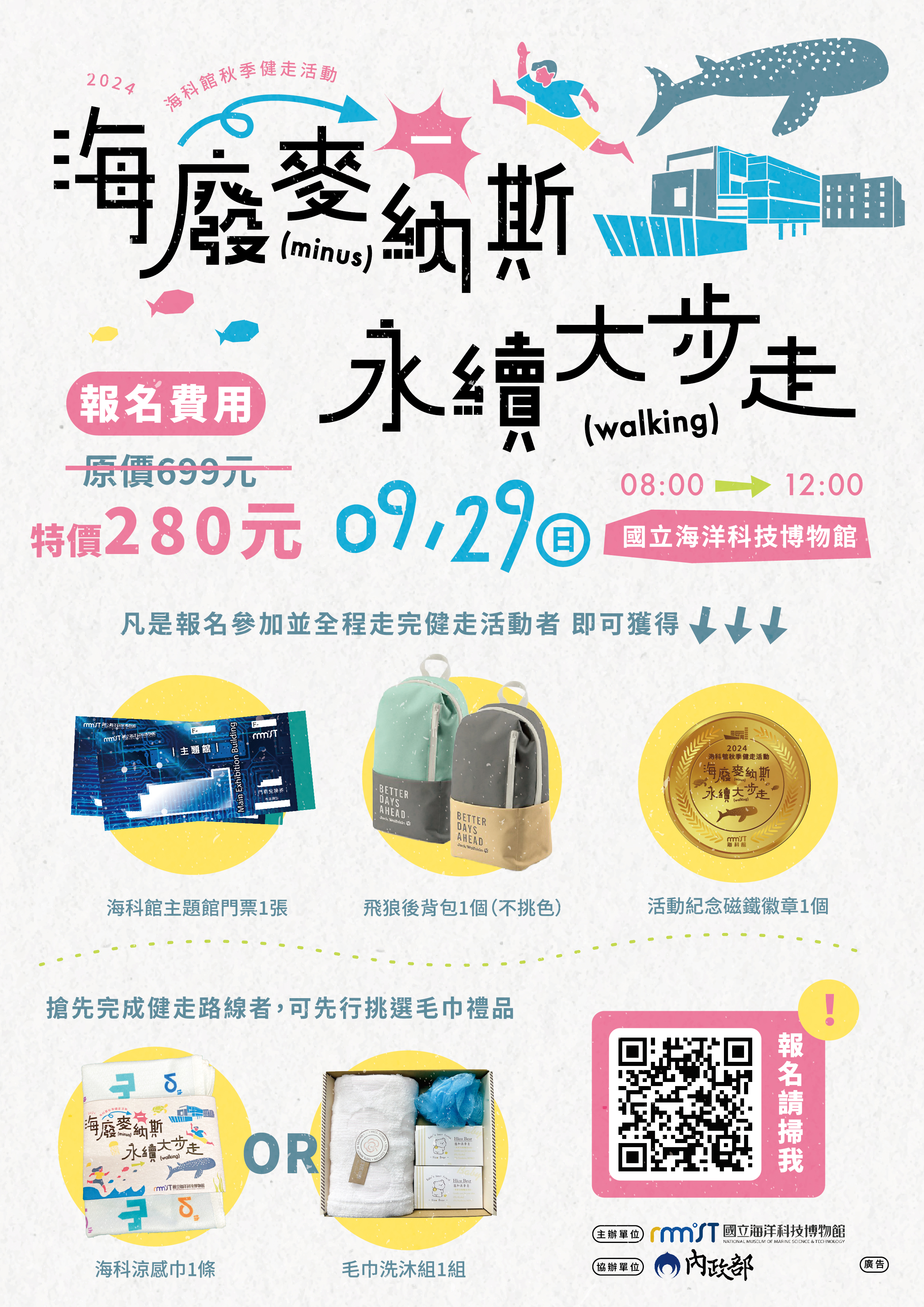「海廢麥納斯 永續大步走」,同時倡議環境議題與健康活力,即日起開放受理報名至9月27日止,報名費用為280元,參加者可獲得價值699元的完走禮品,包括海科館主題館門票一張、飛狼後背包一個,首批完成健走路線的參加者,還可自行挑選海科涼感巾一條或毛巾洗沐組一組,並有完走紀念磁鐵一個。