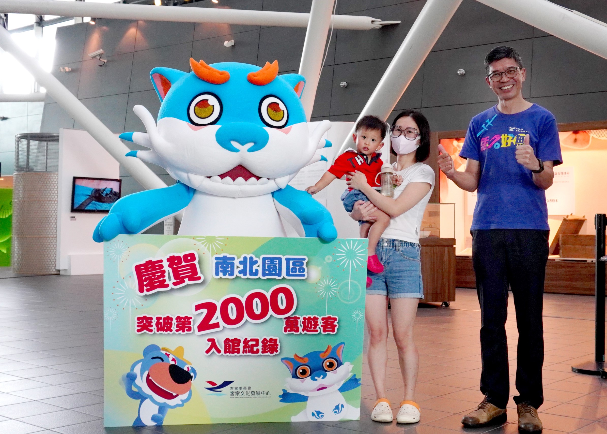 圖1客發中心臺灣客家文化館喜迎第2,000萬名遊客,來自苗栗公館的李小姐常帶著小孩來館舍體驗客家文化,是小孩放電的首選地方。 圖/客發中心提供