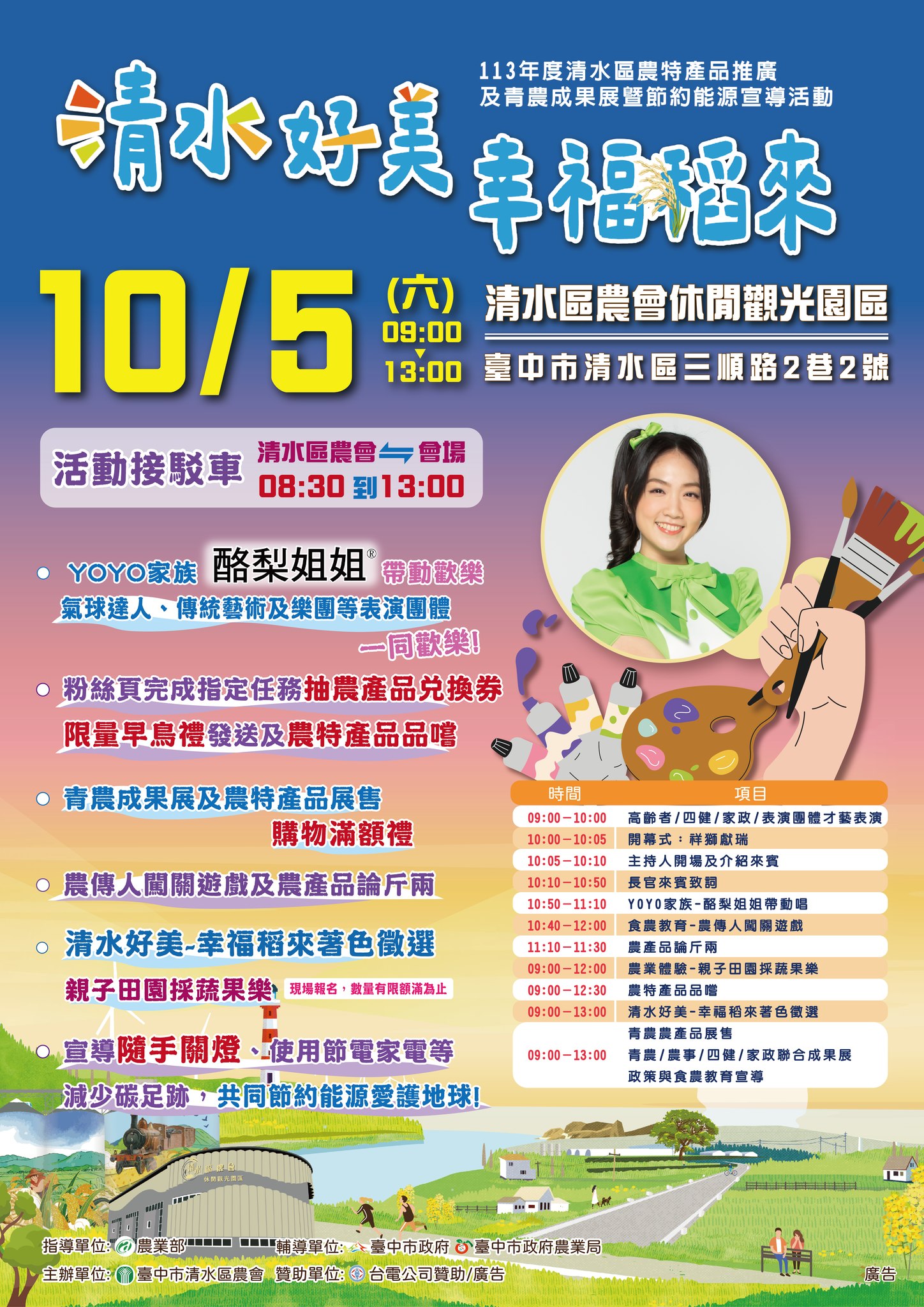 10月5日當天有活動,歡迎參加「清水好美 幸福稻來」,一起享受美食、逛展覽、玩遊戲!記得邀請親友共襄盛舉!
