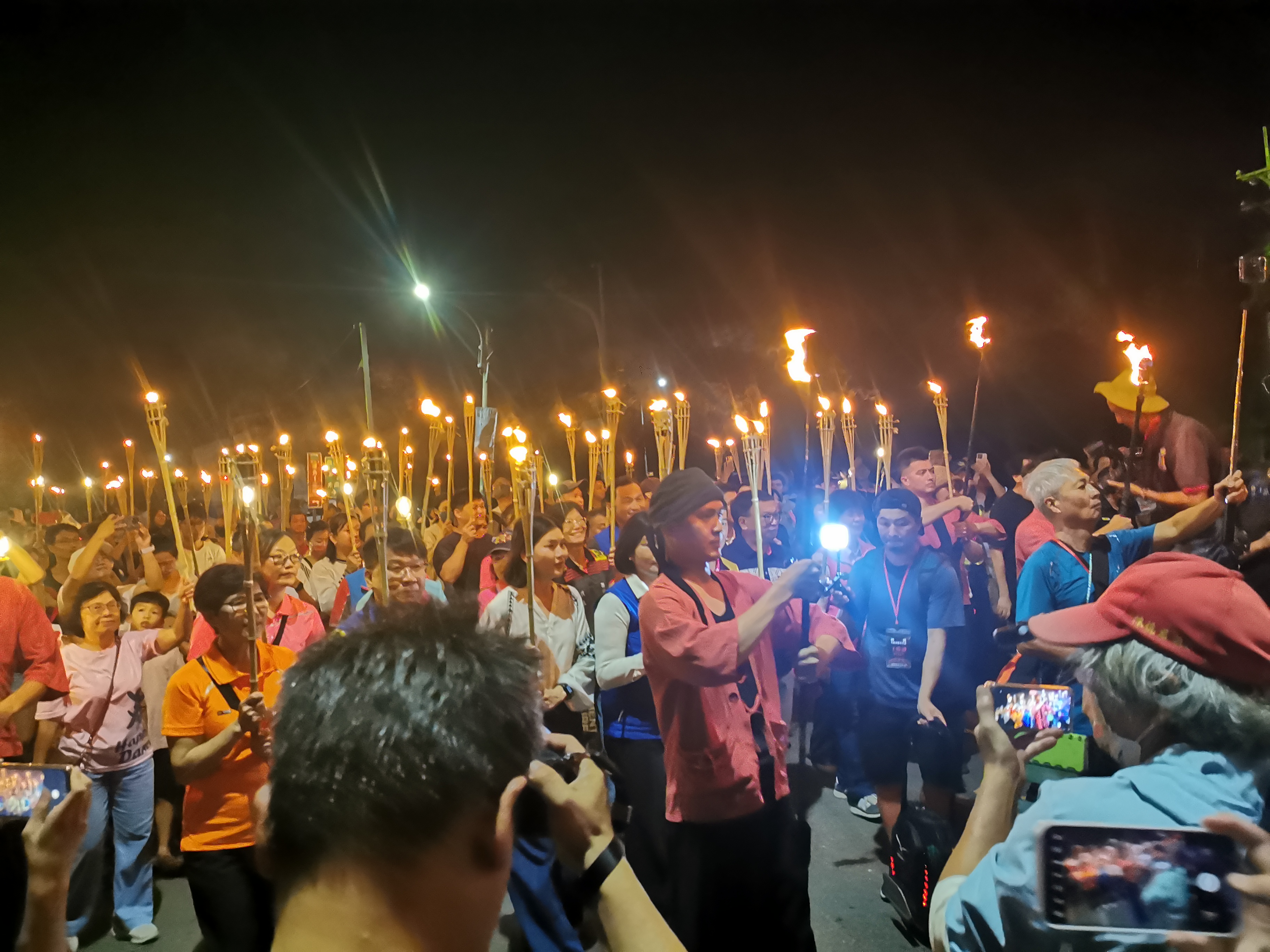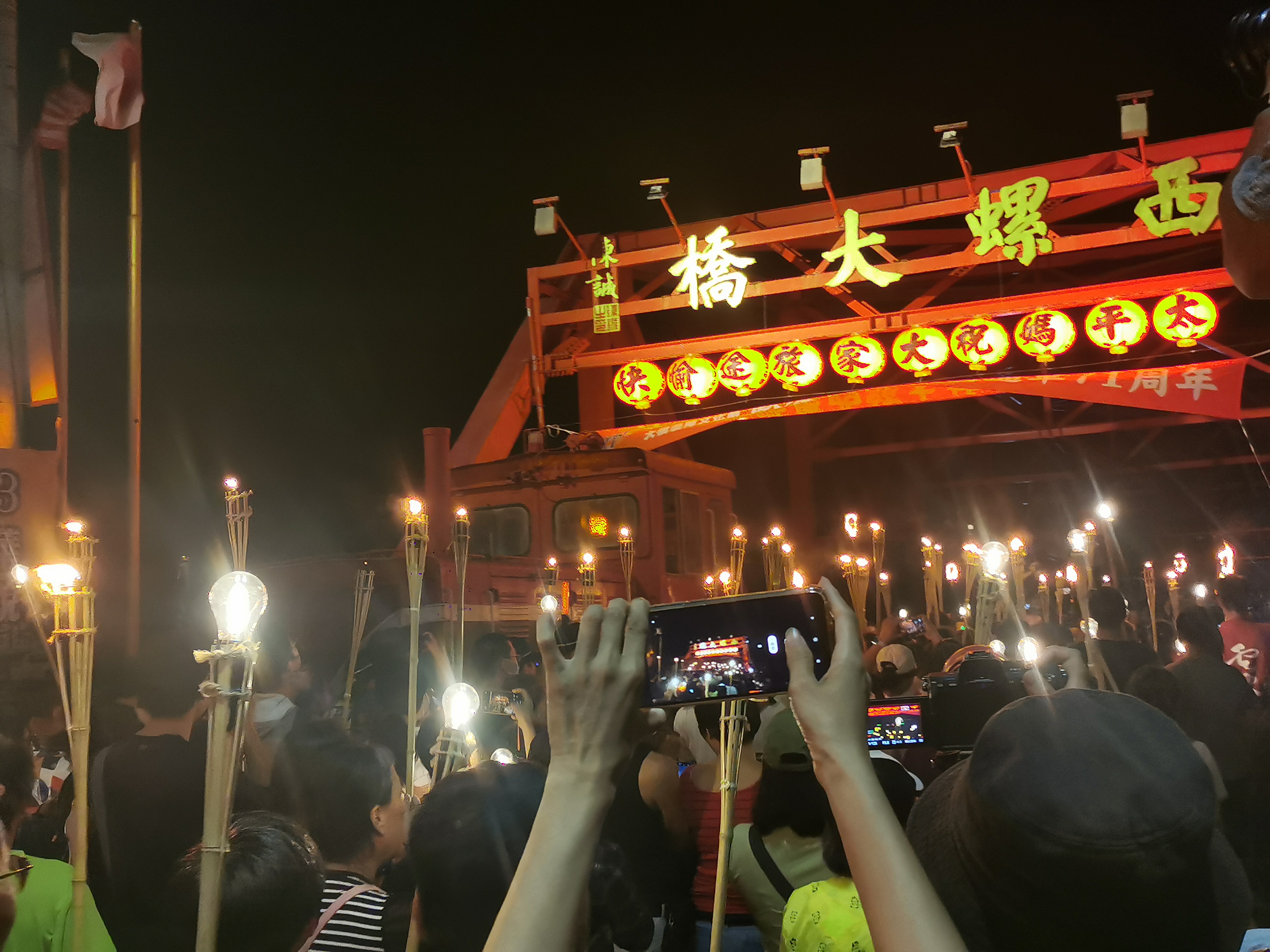 在開幕式雲火火舞表演後,貴賓與民眾舉起火把一同遊行上橋,並在橋中第16墩齊聚點燃聖火台,啟動林國慶大師設計主視覺翻轉字體「國慶在雲林‧祈福好臺灣」中的「祈福」、「雲林」翻轉字的焰火瀑布秀,場面熱鬧萬分。