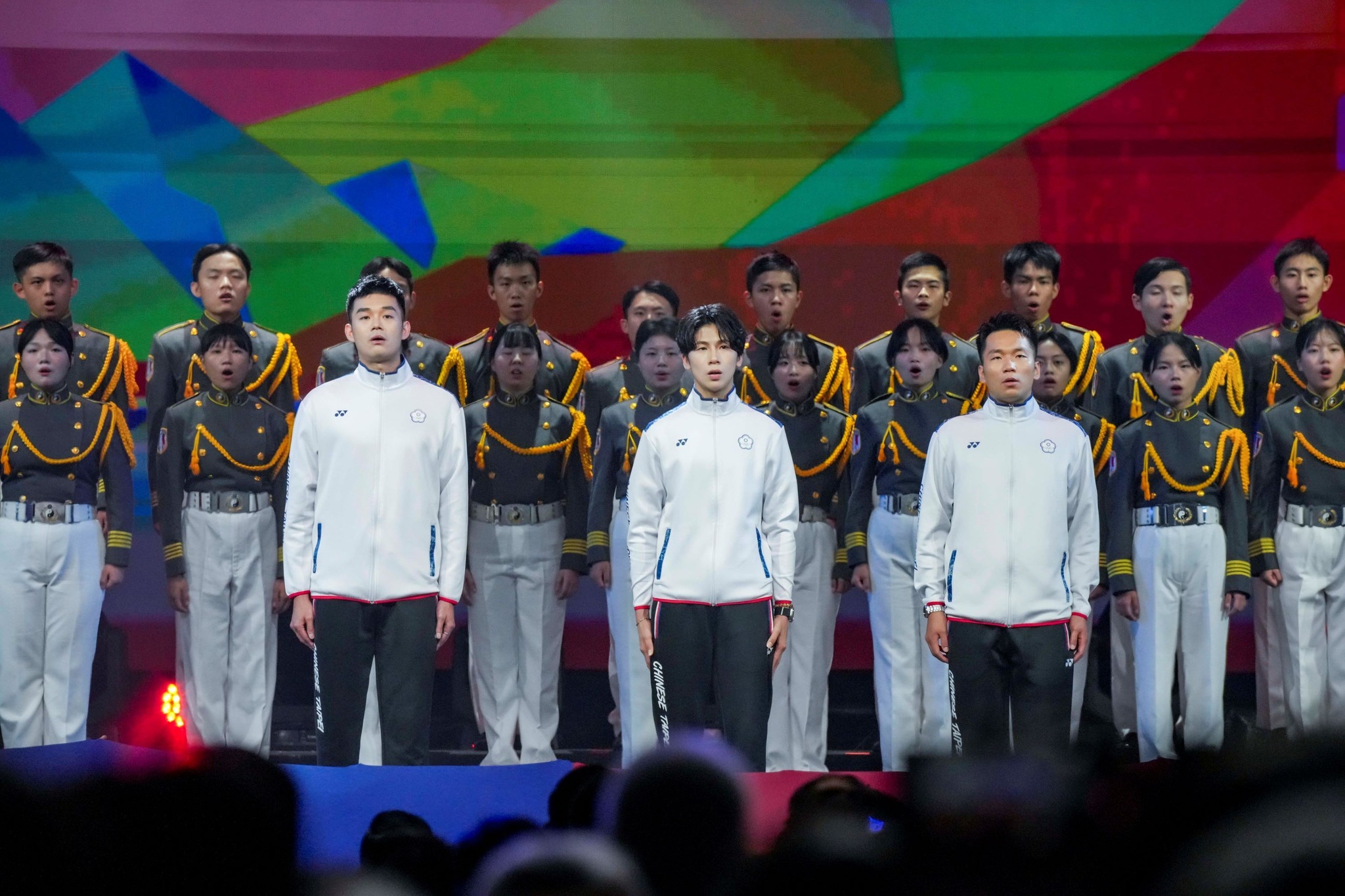 中華隊巴黎奧運金牌健兒羽球男子雙打王齊麟與李洋、女子拳擊林郁婷,共同帶領全場觀眾齊唱中華民國國歌、國旗歌。 圖/臺北市政府觀光傳播局提供