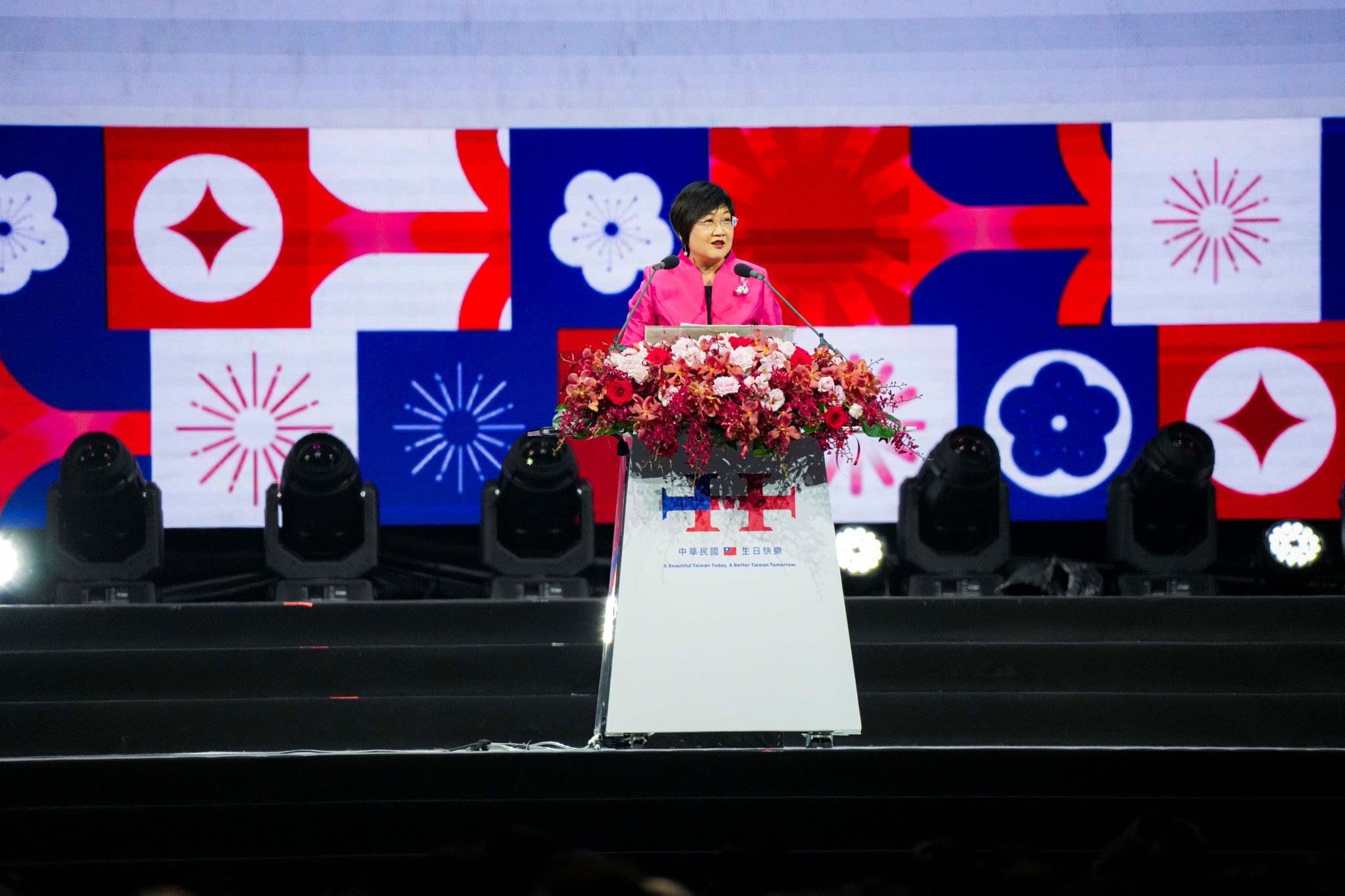 臺北市政府觀光傳播局指出,今年國慶晚會以「中華民國生日快樂」作為禮讚主軸,並搭配精彩多元的節目內容,包括國歌傳頌、啦啦隊應援、名模時尚秀及各界天王天后輪番演唱等,「二姊」江蕙也登臺獻唱,讓全場氣氛沸騰。